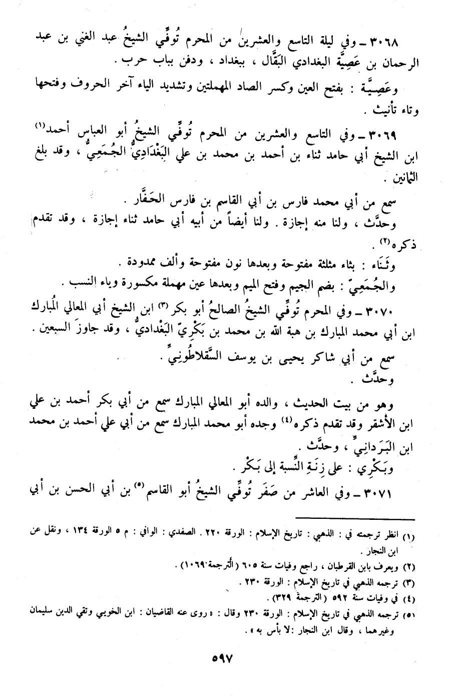 3068 - وفي ليلة التاسع والعشرين من المحرم توفي الشيخ عبد الغني بن عبد الرحمان بن عصية البغدادي البقال، ببغداد، ودفن بباب حرب.