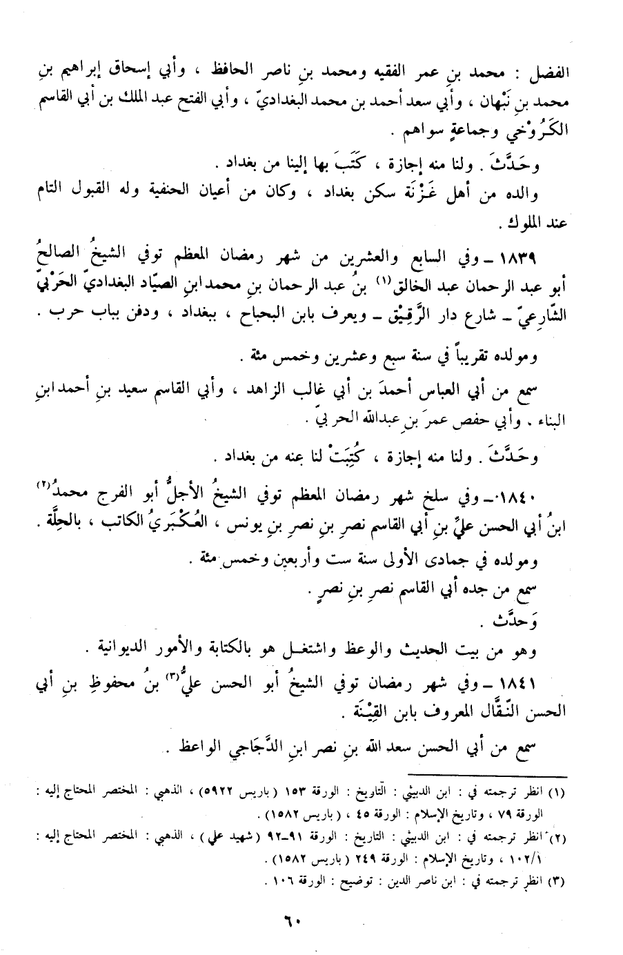 1839 - وفي السابع والعشرين من شهر رمضان المعظم توفي الشيخ الصالح أبو عبد الرحمان عبد الخالق بن عبد الرحمان بن محمد ابن الصياد البغدادي الحربي الشارعي -شارع دار الرقيق- ويعرف بابن البحباح، ببغداد، ودفن بباب حرب.