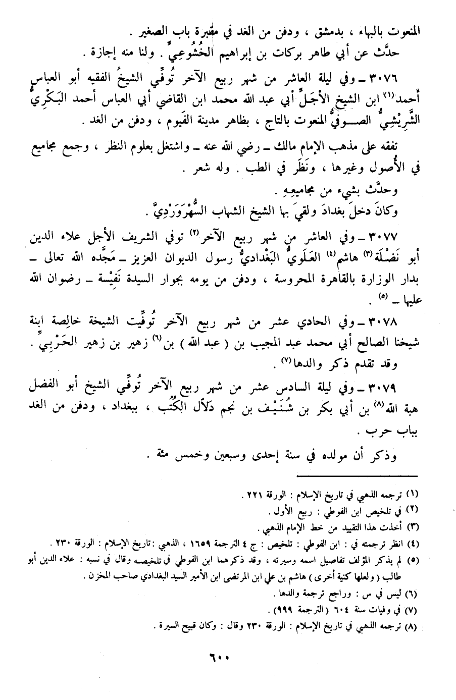 3079 - وفي ليلة السادس عشر من شهر ربيع الآخر توفي الشيخ أبو الفضل هبة الله بن أبي بكر بن شنيف بن نجم دلال الكتب، ببغداد، ودفن من الغد بباب حرب.