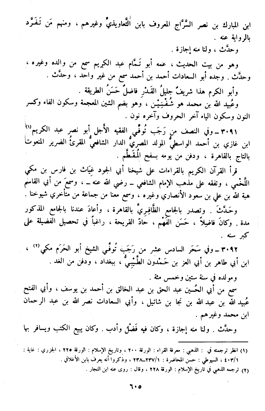3092 - وفي سحر السادس عشر من رجب توفي الشيخ أبو الحرم مكي، بن أبي طاهر بن أبي العز بن حمدون الطيبي، ببغداد، ودفن من الغد.
