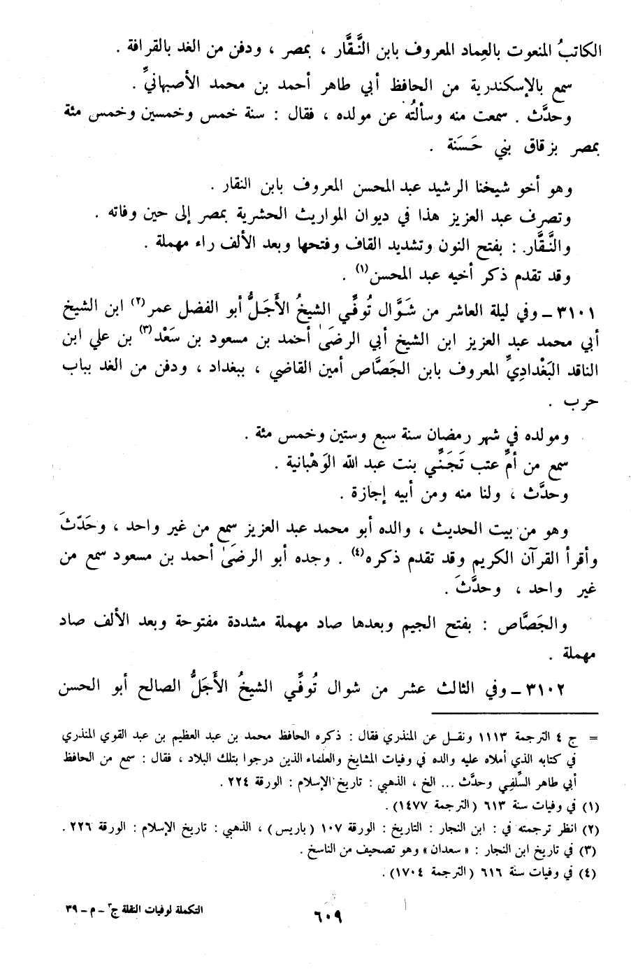 3101 - وفي ليلة العاشر من شوال توفي الشيخ الأجل أبو الفضل عمر ابن الشيخ أبي محمد عبد العزيز ابن الشيخ أبي الرضى أحمد بن مسعود بن سعد بن علي ابن الناقد البغدادي المعروف بابن الجصاص أمين القاضي، ببغداد، ودفن من الغد بباب حرب.