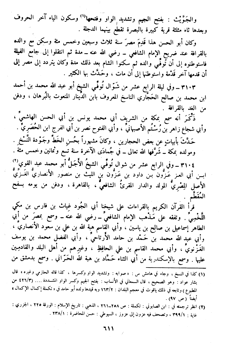 3104 - وفي الرابع عشر من شوال توفي الشيخ الأجل أبو محمد عبد القوي بن أبي العز عزون بن داود بن عزون بن الليث بن منصور الأنصاري الغزي الأصل المصري المولد والدار المقرئ الشافعي، بالقاهرة، ودفن من يومه بسفح المقطم.