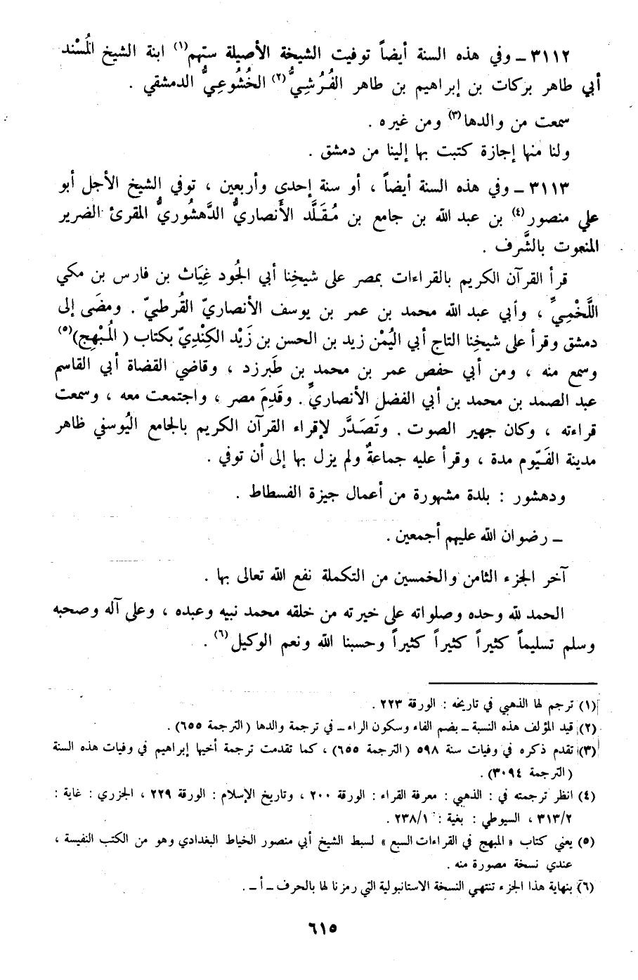 3112 - وفي هذه السنة أيضا توفيت الشيخة الأصيلة ستهم ابنة الشيخ المسند أبي طاهر بركات بن إبراهيم بن طاهر الفرشي الخشوعي الدمشقي