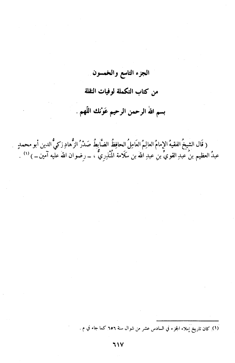 (قال الشيخ الفقيه الإمام العالم العامل الحافظ الضابط صدر الزهاد زكي الدين أبو محمد عبد العظيم بن عبد القوي بن عبد الله بن سلامة المنذري، -رضوان الله عليه آمين-).