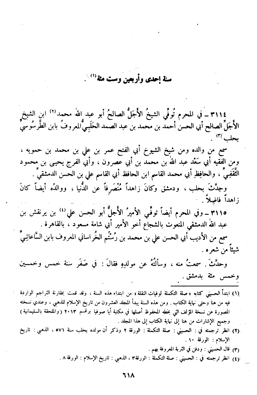 3114 - في المحرم توفي الشيخ الأجل الصالح أبو عبد الله محمد ابن الشيخ الأجل الصالح أبي الحسن أحمد بن محمد بن عبد الصمد الحلبي المعروف بابن الطرسوسي بحلب.