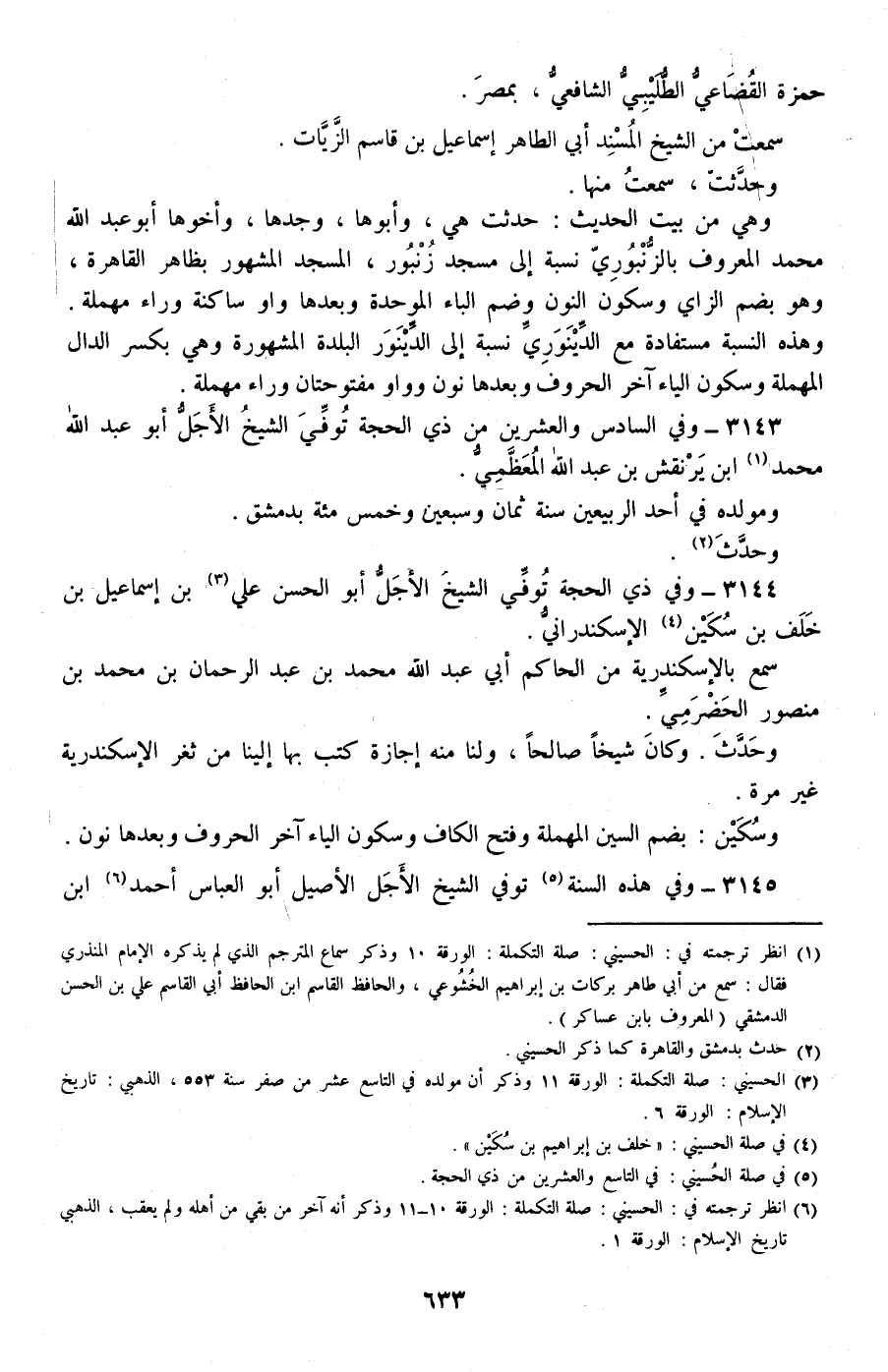 3145 - وفي هذه السنة توفي الشيخ الأجل الأصيل أبو العباس أحمد ابن الشيخ الأجل المسند أبي الفتح محمد ابن الفقيه الأجل أبي العباس أحمد بن بختيار بن علي بن محمد الواسطي المعروف بابن المندائي #634# حاجا.