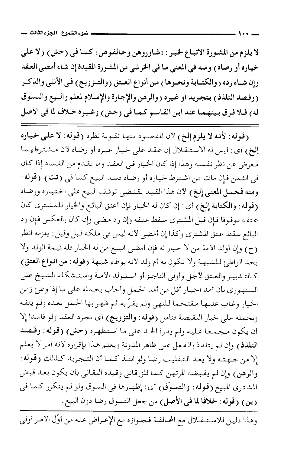 لا يلزم من المشورة الاتباع لخبر: «شاوروهن وخالفوهن» كما فى (حش) (لا على خياره أو رضاه) ومنه فى المعنى ما فى الخرشى من المشورة المقيدة إن شاء أمضى العقد وإن شاء رده (والكتابة ونحوها) من أنواع العتق (والتزويج) فى الأنثى والذكر (وقصد التلذذ) بتجريد أو غيره (والرهن والإجارة والإسلام لمعلم والبيع والتسوّق له) فلا فرق بينهما عند ابن القاسم كما فى (حش) وغيره خلافا لما فى الأصل