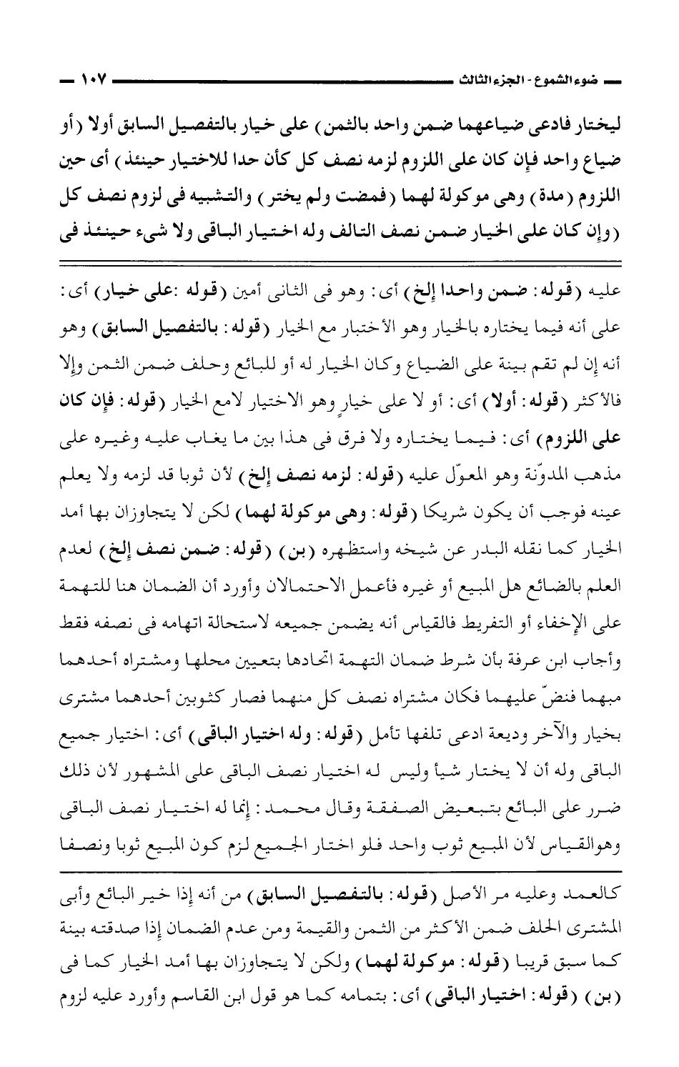 كالعمد وعليه مر الأصل (قوله: بالتفصيل السابق) من أنه إذا خير البائع وأبى المشترى الحلف ضمن الأكثر من الثمن والقيمة ومن عدم الضمان إذا صدقته بينة كما سبق قريبا (قوله: موكولة لهما) ولكن لا يتجاوزان بها أمد الخيار ك ما فى (بن) (قوله: اختيار الباقى) أى: بتمامه كما هو قول ابن القاسم وأورد عليه لزوم