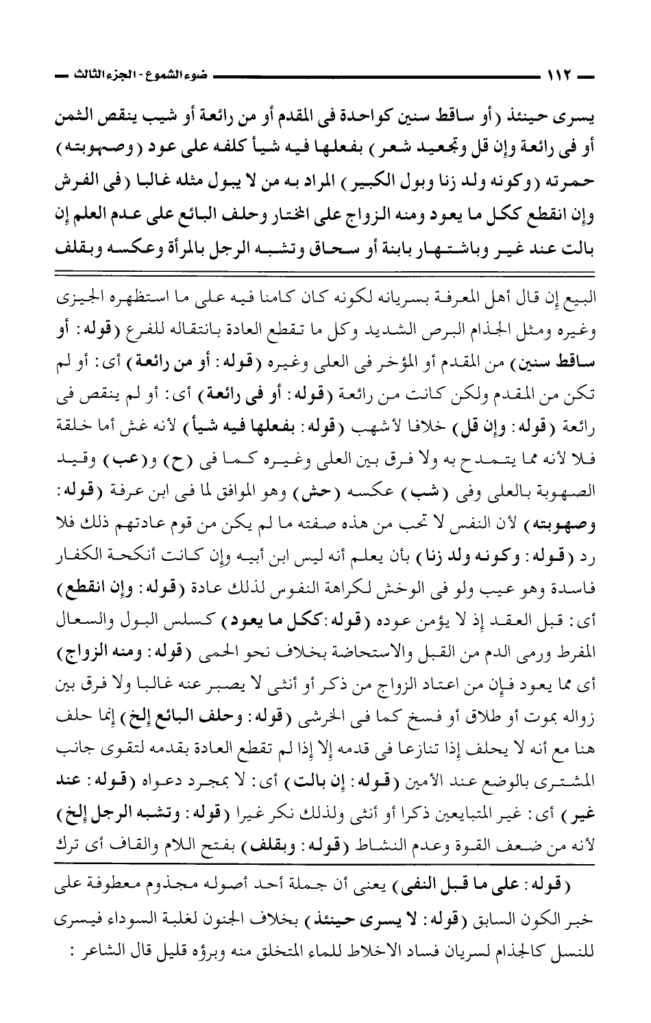 البيع إن قال أهل المعرفة بسريانه لكونه كان كامنا فيه على ما استظهره الجيزى وغيره ومثل الجذام البرص الشديد وكل ما تقطع العادة بانتقاله للفرع (قوله: أو ساقط سنين) من المقدم أو المؤخر فى العلى وغيره (قوله: أو من رائعة) أى: أو لم تكن من المقام ولكن كانت من رائعة (قوله: أو فى رائعة) أى: أو لم ينقص فى رائعة (قوله: وإن قل) خلافا لأشهب (قوله: بفعلها فيه شيأ) لأنه غش أما خلقة فلا لأنه مما يتمدح به ولا فرق بين العلى وغيره كما فى (ح) و (عب) وقيد الصهوبة بالعلى وفى (شب) عكسه (حش) وهو الموافق لما فى ابن عرفة (قوله: وصهوبته) لأن النفس لا تحب من هذه صفته ما لم يكن من قوم عادتهم ذلك فلا رد (قوله: وكونه ولد زنا) بأن يعلم أنه ليس ابن أبيه وإن كانت أنكحة الكفار فاسدة وهو عيب ولو فى الوخس لكراهة النفوس لذلك عادة (قوله: وإن انقطع) أى: قبل العقد إذ لا يؤمن عوده (قوله: ككل ما يعود) كسلس البول والسعال المفرط ورمى الدم من القبل والاستحاضة بخلاف نحو الحمى (قوله: ومنه الزواج) أى مما يعود فإن من اعتاد الزواج من ذكر أو أنثى لا يصبر عنه غالبا ولا فرق بين زواله بموت أو طلاق أو فسخ كما فى الخرشى (قوله: وحلف البائع إلخ) إنما حلف هنا مع أنه لا يحلف إذا تنازعا فى قدمه إلا إذا لم تقطع العادة بقدمه لتقوى جانب المشترى بالوضع عند الأمين (قوله: إن بالت) أى: لا بمجرد دعواه (قوله: عند غير) أى: غير المتبايعين ذكرا أو أنثى ولذلك نكر غيرا (قوله: وتشبه الرجل إلخ) لأنه من ضعف القوة وعدم النشاط (قوله: وبقلف) بفتح اللام والقاف أى ترك