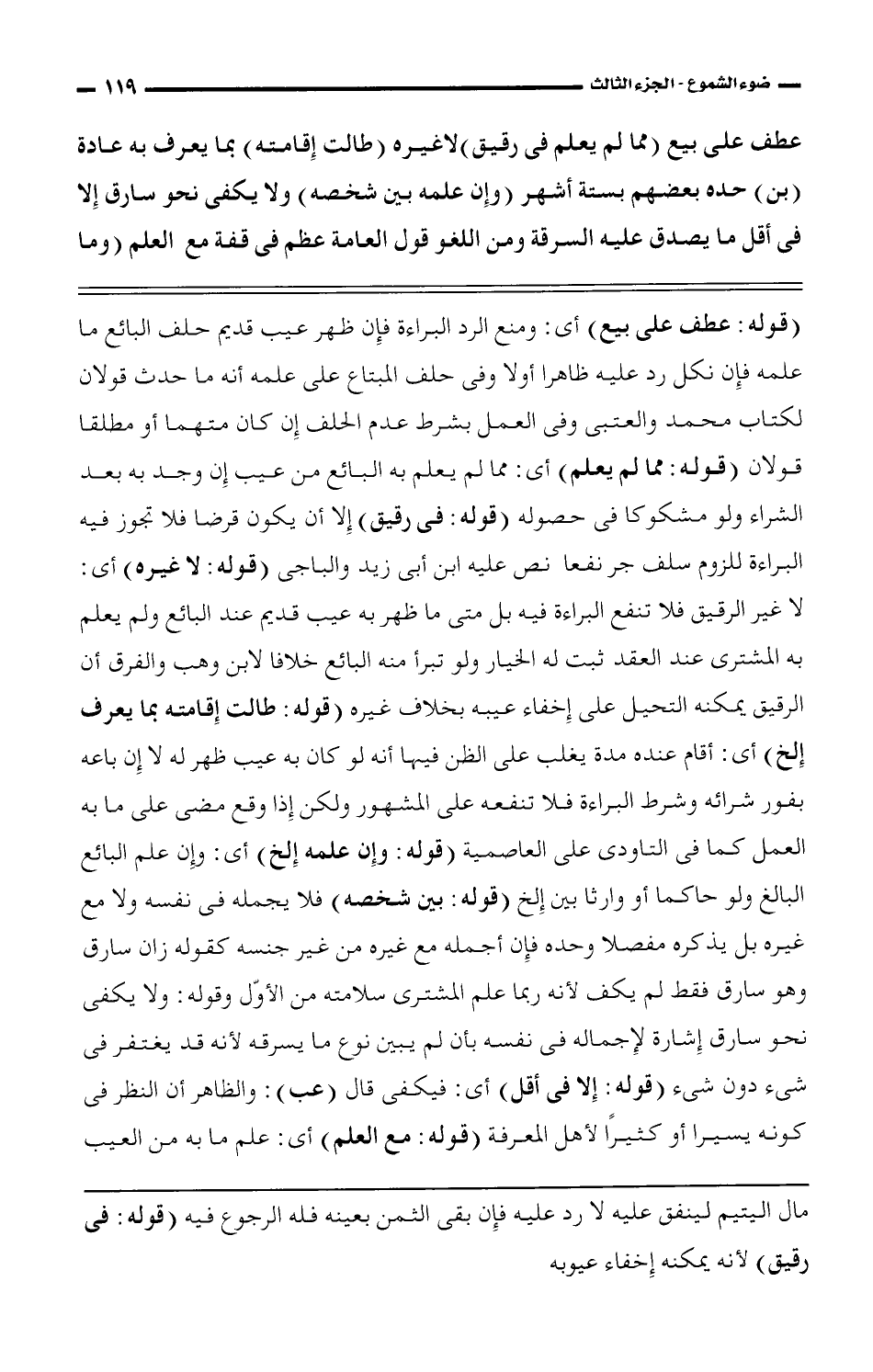 عطف على بيع (مما لم يعلم فى رقيق) لا غيره (طالت إقامته) بما يعرف به عادة (بن) حده بعضهم بستة أشهر (وإن علمه بين شخصه) ولا يكفى نحو سارق إلا فى أقل ما يصدق عليه السرقة ومن اللغو قول العامة عظم فى قفة مع العلم (وما