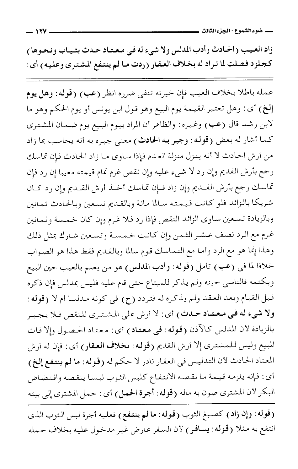 زاد العيب (الحادث وأدب المدلس ولا شئ له فى معتاد حدث بثياب ونحوها) كجلود فصلت لما تراد له بخلاف العقار (ردت ما لم ينتفع المشترى وعليه) أى: