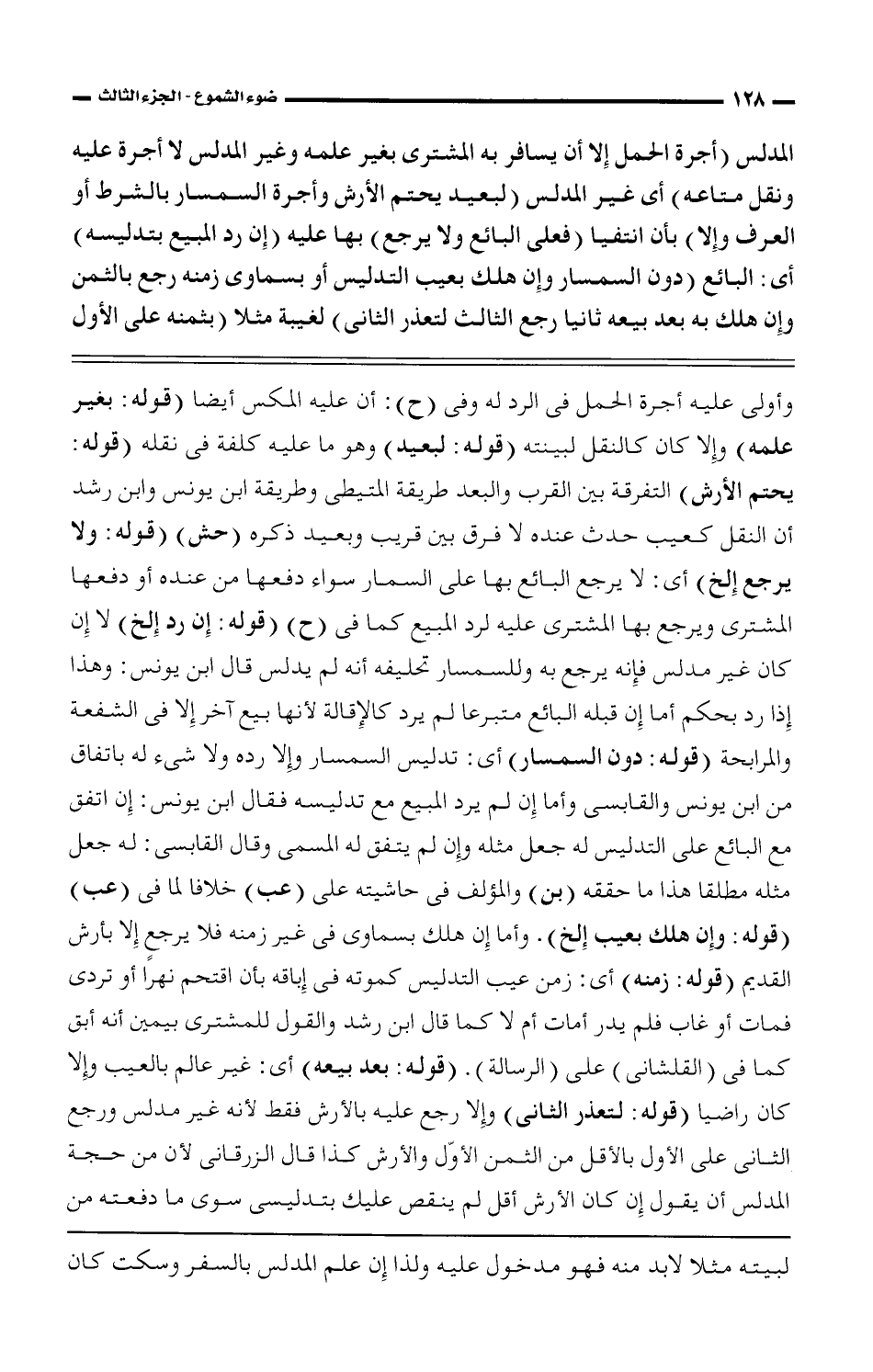 المدلس (أجرة الحمل إلا أن يسافر به المشترى بغير علمه وغير المدلس لا أجرة عليه ونقل متاعه) أى غير المدلس (لبعيد يحتم الأرش وأجرة السمسار بالشرط أو العرف وإلا) بأن انتفيا (فعلى البائع ولا يرجع) بها عليه (إن رد المبيع بتدليسه) أى: البائع (دون السمسار وإن هلك بعيب التدليس أو بسماوى زمنه رجع بالثمن وإن هلك به بعد بيعه ثانيا رجع الثالث لتعذر الثانى) لغيبة مثلا (بثمنه على الأول
