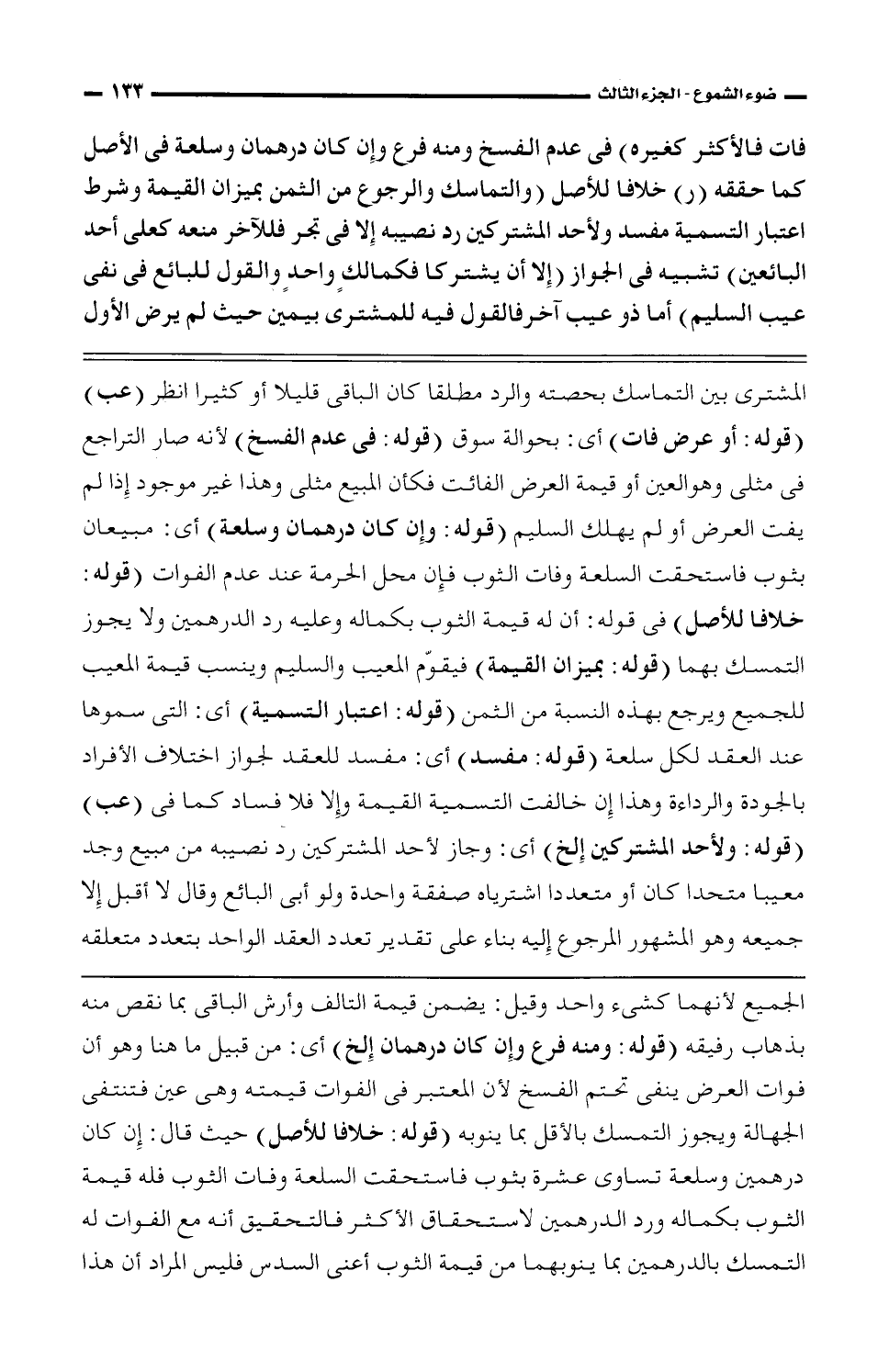 فات فالأكثر كغيره) فى عدم الفسخ ومنه فرع وإن كان درهمان وسلعة فى الأصل كما حققه (ر) خلافا للأصل (والتماسك والرجوع من الثمن بميزان القيمة وشرط اعتبار التسمية مفسد ولأحد المشتركين رد نصيبه إلا فى تجر فللآخر منعه كعلى أحد البائعين) تشبيه فى الجواز (إلا أن يشتركا فكمالكٍ واحدٍ والقول للبائع فى نفى عيب السليم) أما ذو عيب آخر فالقول فيه للمشترى بيمين حيث لم يرض الأول