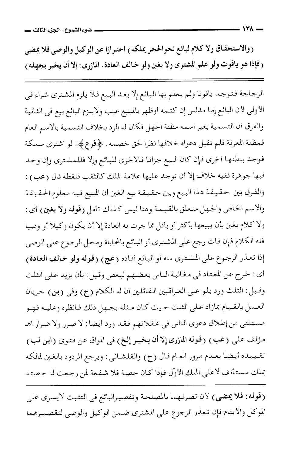 الزجاجة فتوجد ياقوتا ولم يعلم بها البائع إلا بعد البيع فلا يلزم المشترى شراء فى الأولى لأن البائع إما مدلس إن كتمه أو ظهر بالمبيع عيب ولا يلزم البائع بيع فى الثانية والفرق أن التسمية بغير اسمه مظنة الجهل فكان له الرد بخلاف التسمية بالاسم العام فمظنة المعرفة فلم تقبل دعواه خلافها نظرا لحق خصمه. {فرع}: لو اشترى سمكة فوجد ببطنها أخرى فإن كان البيع جزافا فالأخرى للبائع وإلا فللمشترى وإن وجد فيها جوهرة ففيه خلاف إلا أن توجد عليها علامة الملك كالثقب فلقطة قال (عب): والفرق بين حقيقة هذا البيع وبين حقيقة بيع الغبن أن المبيع فيه معلوم الحقيقة والاسم الخاص والجهل متعلق بالقيمة وهنا ليس كذلك تأمل (قوله ولا بغبن) أى: ولا كلام بغبن بأن يبيعها بأكثر أو بأقل مما جرت به العادة إلا أن يكون وكيلا أو وصيا فله الكلام فإن فات رجع على المشترى أو البائع بالمحاباة ومحل الرجوع على الوصى إذا تعذر الرجوع على المشترى منه أو البائع أفاده (عج) (قوله ولو خالف العادة) أى: خرج عن المعتاد فى مغالبة الناس بعضهم لبعض وقيل: بأن يزيد على الثلث وقيل: الثلث ورد بلو على العراقيين أن له الكلام (ح) وفى (بن) جريان العمل بالقيام بما زاد على الثالث حيث كان مثله يجهل ذلك فانظره وعليه فهو مستثنى من إطلاق دعوى الناس فى غفلاتهم فقد ورد أيضا: لا ضرر ولا ضرار اهـ مؤلف على (عب) (قوله المازرى إلا أن يخبر إلخ) فى المواق عن فتوى (ابن لب) تقييده أيضا بعدم مرور العام قال (ح) والقلشانى: ويرجع المردود بالغبن لمالكه بملك مستأنف لا على الملك الأوّل فإذا كان حصة فلا شفعة لمن رجعت له حصته