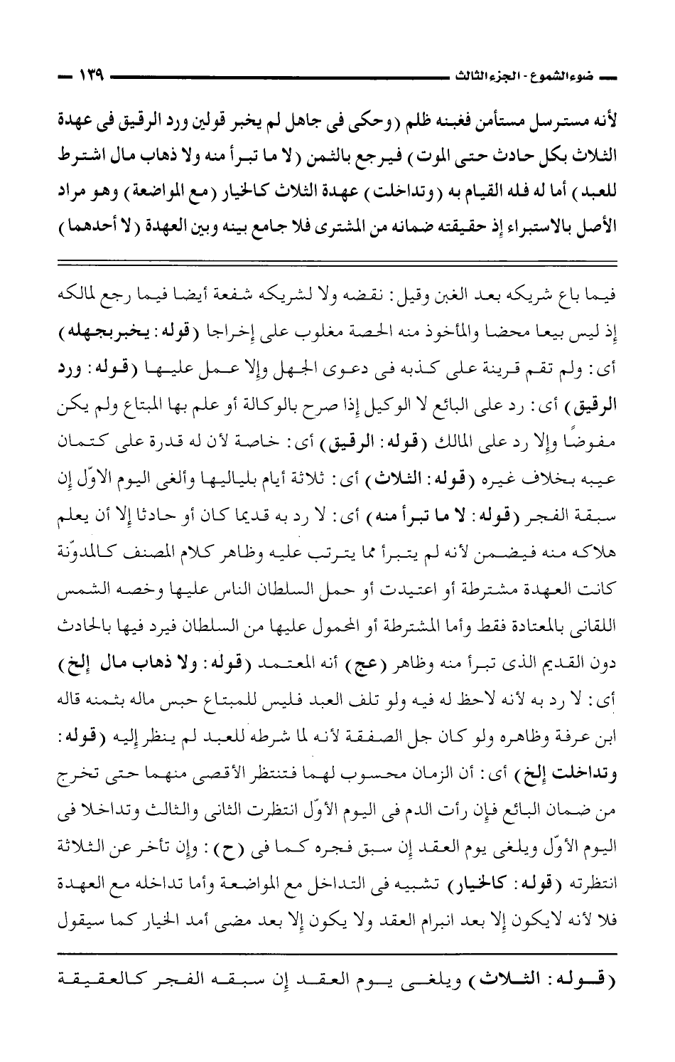 فيما باع شريكه بعد الغبن وقيل: نقضه ولا لشريكه شفعة أيضا فيما رجع لمالكه إذ ليس بيعا محضا والمأخوذ منه الحصة مغلوب على إخراجا (قوله: يخبر بجهله) أى: ولم تقم قرينة على كذبه فى دعوى الجهل وإلا عمل عليها (قوله: ورد الرقيق) أى: رد على البائع لا الوكيل إذا صرح بالوكالة أو علم بها المبتاع ولم يكن مفوضًا وإلا رد على المالك (قوله: الرقيق) أى: خاصة لأن له قدرة على كتمان عيبه بخلاف غيره (قوله: الثلاث) أى: ثلاثة أيام بلياليها وألغى اليوم الأوّل إن سبقة الفجر (قوله: لا ما تبرأ منه) أى: لا رد به قديما كان أو حادثا إلا إن يعلم هلاكه منه فيضمن لأنه لم يتبرأ مما يترتب عليه وظاهر كلام المصنف كالمدوّنة كانت العهدة مشترطة أو اعتيدت أو حمل السلطان النس عليها وخصه الشمس اللقانى بالمعتادة فقط وأما المشترطة أو المحمول عليها من السلطان فيرد فيها بالحادث دون القديم الذى تبرأ منه وظاهر (عج) أنه المعتمد (قوله: ولا ذهاب مال إلخ) أى: لا رد به لأنه لاحظ له فيه ولو تلف العبد فليس للمبتاع حبس ماله بثمنه قاله ابن عرفة وظاهره ولو كان جل الصفقة لأنه لما شرطه للعبد لم ينظر إليه (قوله: وتداخلت إلخ) أى: أن الزمان محسوب لهما فتنتظر الأقصى منهما حتى تخرج من ضمان البائع فإن رأت الدم فى اليوم الأوّل انتظرت الثانى والثالث وتداخلا فى اليوم الأوّل ويلغى يوم العقد إن سبق فجره كما فى (ح): وإن تأخر عن الثلاثة انتظرته (قوله: كالخيار) تشبيه فى التداخل مع المواضعة وأما تداخله مع العهدة فلا لأنه لا يكون إلا بعد نبرام العقد ولا يكون إلا بعد مضى أمد الخيار كما سيقول