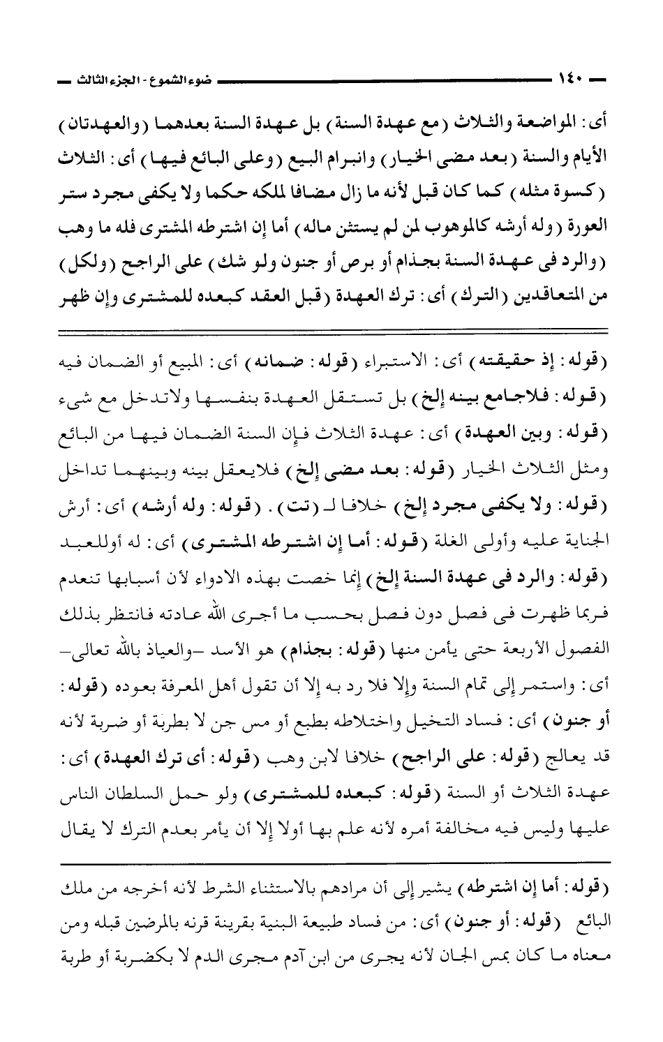 أى: المواضعة والثلاث (مع عهدة السنة) بل عهدة السنة بعدهما (والعهدتان) الأيام والسنة (بعد مضى الخيار) وانبرام البيع (وعلى البائع فيها) أى: الثلاث (كسوة مثله) كما كان قبل لأنه ما زال مضافا لملكه حكما ولا يكفى مجرد ستر العورة (وله أرشه كالموهوب لمن لم يستثن ماله) أما إن اشترطه المشترى فله ما وهب (والرد فى عهدة السنة بجذام أو برص أو جنون ولو شك) على الراجح (ولكل) من المتعاقدين (الترك) أى: ترك العهدة (قبل العقد كبعده للمشترى وإن ظهر