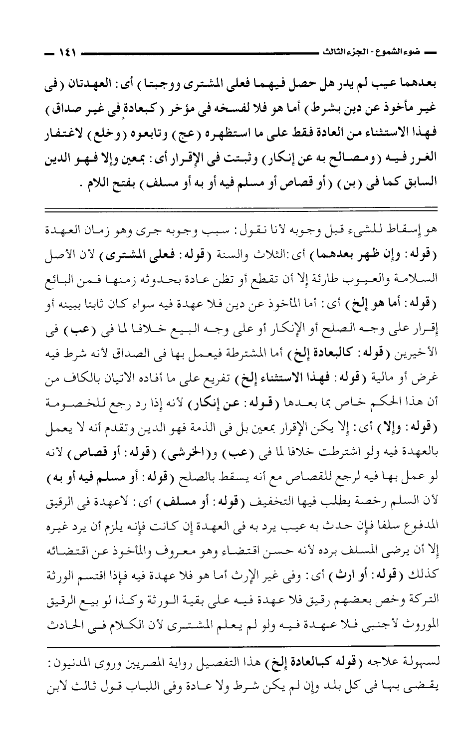 هو إسقاط للشئ قبل وجوبه لأنا نقول: سبب وجوبه جرى وهو زمان العهدة (قوله: وإن ظ هر بعدهما) أى: الثلاث والسنة (قوله: فعلى المشترى) لأن الأصل السلامة والعيوب طارئة إلا أن تقطع أو تظن عادة بحدوثه زمنها فمن البائع (قوله: أما هو إلخ) أى: أما المأخوذ عن دين فلا عهدة فيه سواء كان ثابتا ببينه أو إقرار على وجه الصلح أو الإنكار أو على وجه البيع خلافا لما فى (عب) فى الأخيرين (قوله: كالبعادة إلخ) أما المشترطة فيعمل بها فى الصداق لأنه شرط فيه غرض أو مالية (قوله: فهذا الاستثناء إلخ) تفريع على ما أفاده الاتبان بالكاف من أن هذا الحكم خاص بما بعدها (قوله: عن إنكار) لأنه إذا رد رجع للخصومة (قوله: وإلا) أى: إلا يكن الإقرار بمعين بل فى الذمة فهو الدين وتقدم أنه لا يعمل بالعهدة فيه ولو اشترطت خلافا لما فى (عب) و (الخرشى) (قوله: أو قصاص) لأنه لو عمل بها فيه لرجع للقصاص مع أنه يسقط بالصلح (قوله: أو مسلم فيه أو به) لأن السلم رخصة يطلب فيها التخفيف (قوله: أو مسلف) أى: لا عهدة فى الرقيق المدفوع سلفا فإن حدث به عيب يرد به فى العهدة إن كانت فإنه يلزم أن يرد غيره إلا أن يرضى المسلف برده لأنه حسن اقتضاء وهو معروف والمأخوذ عن اقتضائه كذلك (قوله: أو ارث) أى: وفى غير الإرث أما هو فلا عهدة فيه فإذا اقتسم الورثة التركة وخص بعضهم رقيق فلا عهدة فيه على بقية الورثة وكذا لو بيع الرقيق الموروث لأجنبى فلا عهدة فيه ولو لم يعلم المشترى لأن الكلام فى الحادث