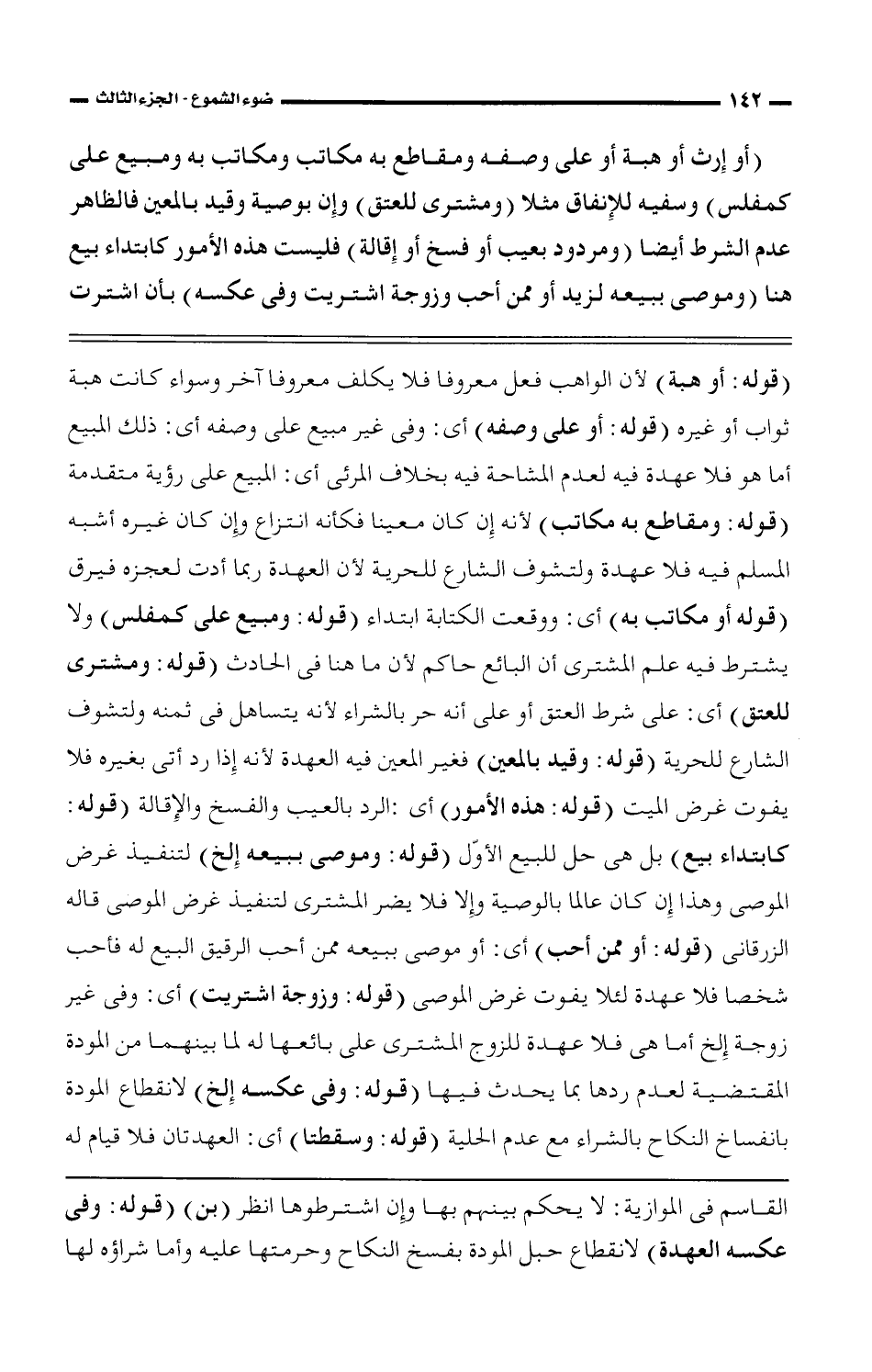 (أو إرث أو هبة أو على وصفه ومقاطع به مكاتب ومكاتب به ومبيع على كمفلس) وسفيه للإنفاق مثلا (ومشترى للعتق) وإن بوصية وقيد بالمعين فالظاهر عدم الشرط أيضا (ومردود بعيب أو فسخ أو إقالة) فليست هذه الأمور كابتداء بيع هنا (وموصى ببيعه لزيد أو ممن أحب وزوجه اشتريت وفى عكسه) بأن اشترت