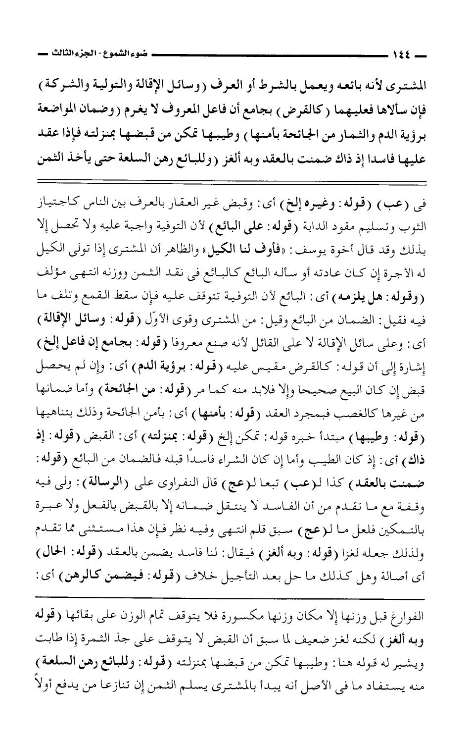 المشترى لأنه بائعه ويعمل بالشرط أو العرف (وسائل الإقالة والتولية والشركة) فإن سألاها فعليهما (كالقرض) بجامع أن فاعل المعروف لا يغرم (وضمان المواضعة برؤية الدم والثمار من الجائحة بأمنها) وطيبها تمكن من قبضها بمنزلته فإذا عقد عليها فاسدا إذا ذاك ضمنت بالعقد وبه ألغز (وللبائع رهن السلعة حتى يأخذ الثمن