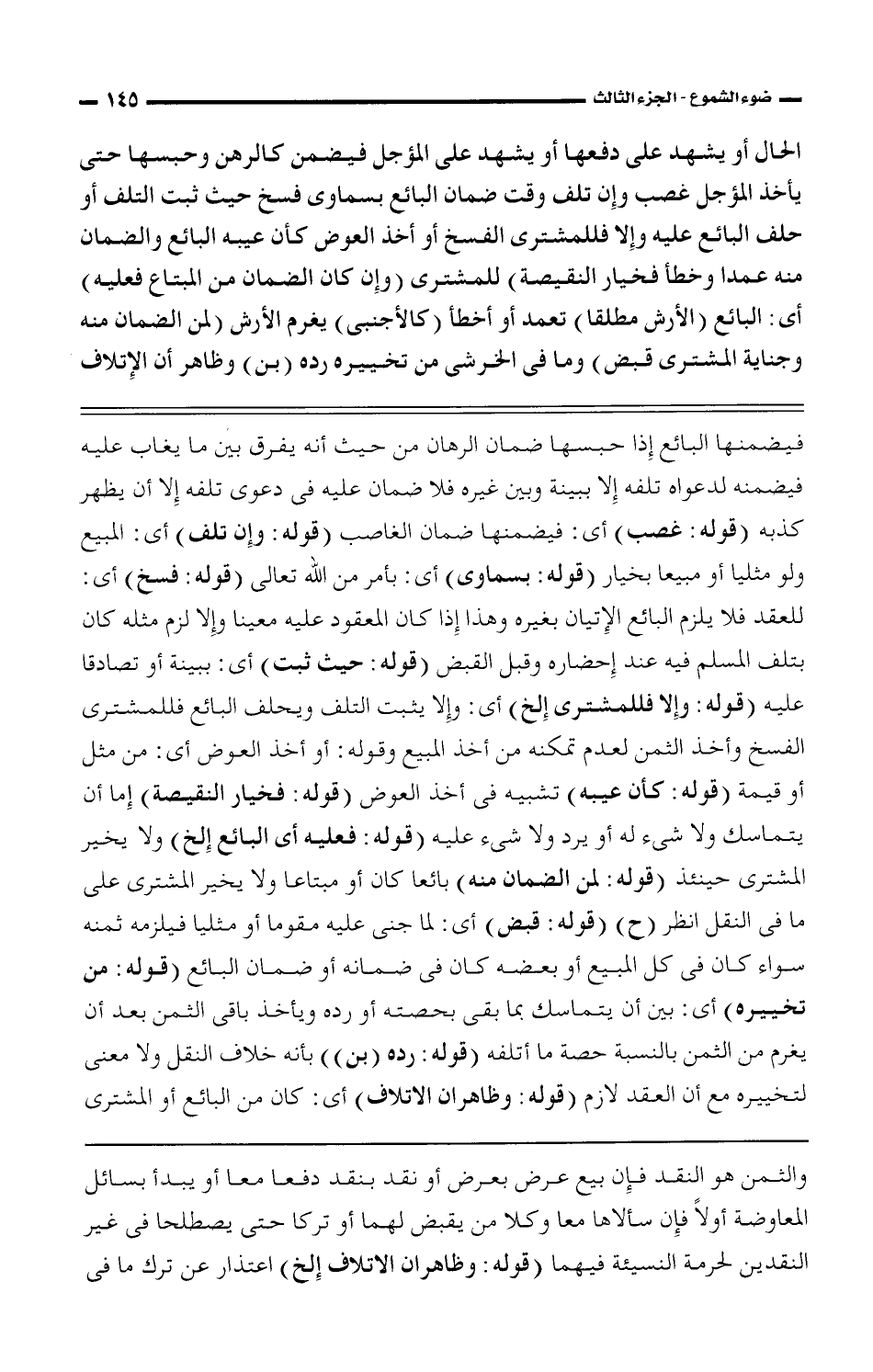 فيضمنها البائع إذا حبسها ضمان الرهن من حيث أنه يفرق بين ما يغاب عليه فيضمنه لدعواه تلفه إلا ببينة وبين غيره فلا ضمان عليه فى دعوى تلفه إلا أن يظهر كذبه (قوله: غصب) أى: فيضمنها ضمان الغاصب (قوله: وإن تلف) أى: المبيع ولو مثليا أو مبيعا بخيار (قوله: بسماوى) أى: بأمر من الله تعالى (قوله: فسخ) أى: للعقد فلا يلزم البائع الإتيان بغيره وهذا إذا كان المعقود عليه معينا وإلا لزم مثله كان بتلف المسلم فيه عند إحضاره وقبل القبض (قوله: حيث ثبت) أى: ببينة أو تصادقا عليه (قوله: وإلا فللمشترى إلخ) أى: وإلا يثبت التلف ويحمل البائع فللمشترى الفسخ وأخذ الثمن لعدم تمكنه من أخذ المبيع وقوله: أو أخذ العوض أى: من مثل أو قيمة (قوله: كأن عيبه) تشبيه فى أخذ العوض (قوله: فخيار النقيصة) إما أن يتماسك ولا شئ له أو يرد ولا شئ عليه (قوله: فعليه أى البائع إلخ) ولا يخير المشترى حينئذ (قوله: لمن الضمان منه) بائعا لما جنى عليه مقوما أو مثليا فيلزمه ثمنه سواء كان فى كل المبيع أو بعضه كان فى ضمانه أو ضمان البائع (قوله: من تخييره) أى: بين أن يت ماسك بما بقى بحصته أو رده ويأخذ باقى الثمن بعد أن يغرم من الثمن بالنسبة حصة ما أتلفه (قوله: رده (بن) بأنه خلاف النقل ولا معنى لتخييره مع أن العقد لازم (قوله: وظاهران الاتلاف) أى: كان من البائع أو المشترى