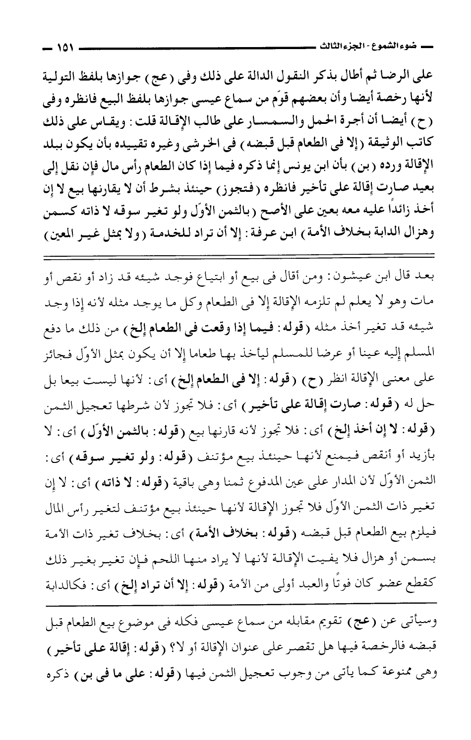 على الرضا ثم أطال بذكر النقول الدالة على ذلك وفى (عج) جوازها بلفظ التولية لأنها رخصة أيضا وأن بعضهم قوّم من سماع عيسى جوازها بلفظ البيع فانظره وفى (ح) أيضا أن أجرة الحمل والسمسار على طالب الإقالة قلت: ويقاس على ذلك كاتب الوثيقة (إلا فى الطعام قبل قبضه) فى الخرشى وغيره تقييده بأن يكون ببلد الإقالة ورده (بن) بأن ابن يونس إنما ذكره فيما إذا كان الطعام رأس مال فإن نقل إلى بعيد صارت إقالة على تأخير فانظره (فتجوز) حينئذ بشرط أن لا يقارنها بيع لا إن أخذ زائدًا عليه معه بعين على الأصح (بالثمن الأوّل ولو تغير سوقه لا ذاته كسمن وهزال الدابة بخلاف الأمة) ابن عرفة: إلا أن تراد للخدمة (ولا بمثل غير المعين)