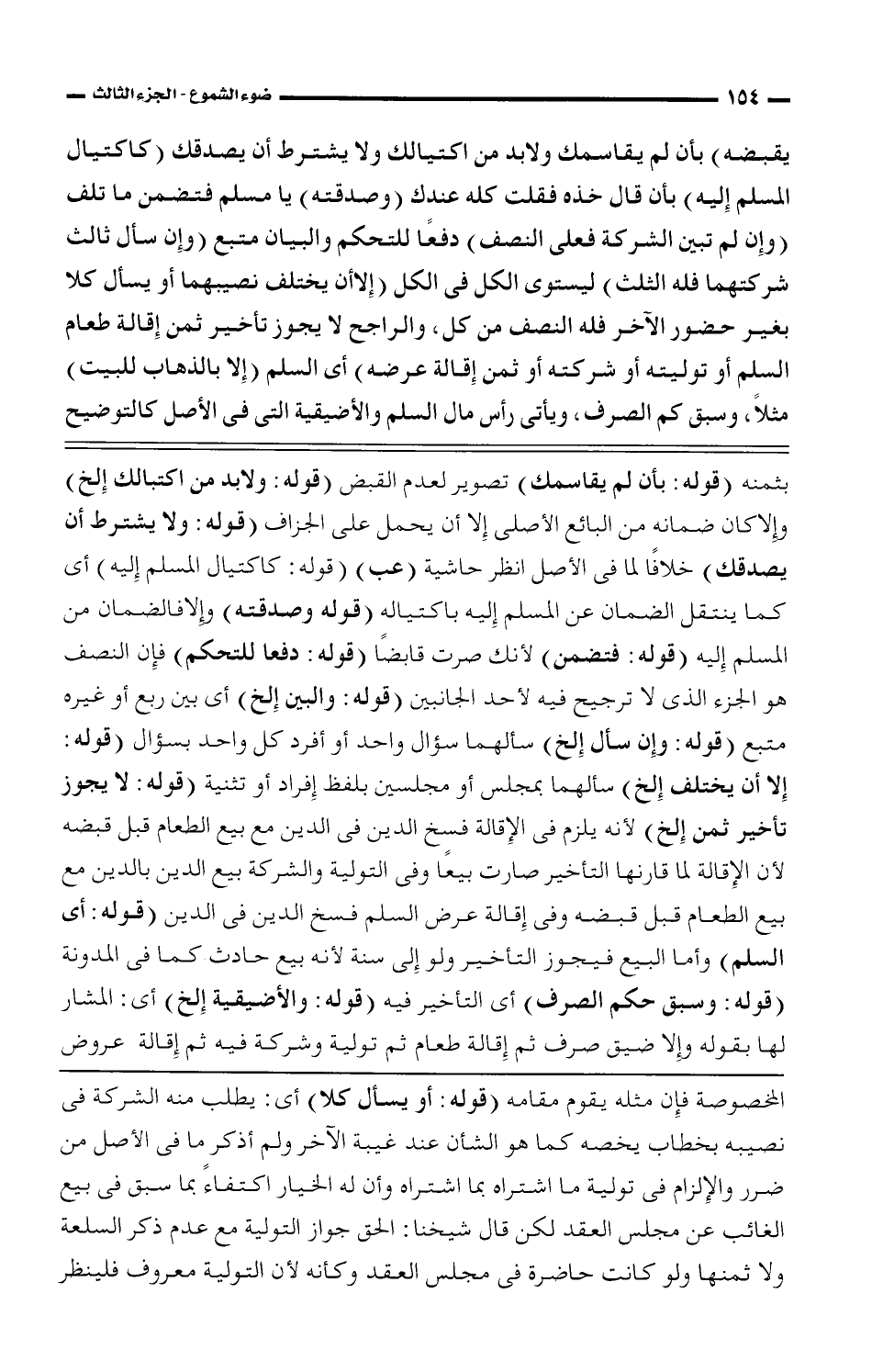 بثمنه (قوله: بأن لم يقاسمك) تصوير لعدم القبض (قوله: ولابد من اكتبالك إلخ) وإلا كان ضمانه من البائع الأصلى إلا أني حمل على الجزاف (قوله: ولا يشترط أن يصدقك) خلافًا لما فى الأصل انظر حاشية (عب) (قوله: كاكتيال المسلم إليه) أى كما ينتقل الضمان عن المسلم إليه باكتياله (قوله وصدقته) وإلا فالضمان من المسلم إليه (قوله: فتضمن) لأنك صرت قابضًا (قوله: دفعا للتحكم) فإن النصف هو الجزء الذى لا ترجيح فيه لأحد الجانبين (قوله: والبين إلخ) أى بين ربع أو غيره متبع (قوله: وإن سأل إلخ) سألهما سؤال واحد أو أفرد كل واحد بسؤال (قوله: إلا أن يختلف إلخ) سألهما بمجلس أو مجلسين بلفظ إفراد أو تثنية (قوله: لا يجوز تأخير ثمن إلخ) لأنه يلزم فى الإقالة فسخ الدين فى الدين مع بيع الطعام قبل قبضه لأن الإقالة لما قارنها التأخير صارت بيعًا وفى التولية والشركة بيع الدين بالدين مع بيع الطعام قبل قبضه وفى إقالة عرض السلم فسخ الدين فى الدين (قوله: أى السلم) وأما البيع فيجوز التأخير ولو إلى سنة لأنه بيع حادث كما فى المدونة (قوله: وسبق حكم الصرف) أى التأخير فيه (قوله: والأضيقية إلخ) أى: المشار لها بقوله وإلا ضيق صرف ثم إقالة طعام ثم تولية وشركة فيه ثم إقالة عروض
