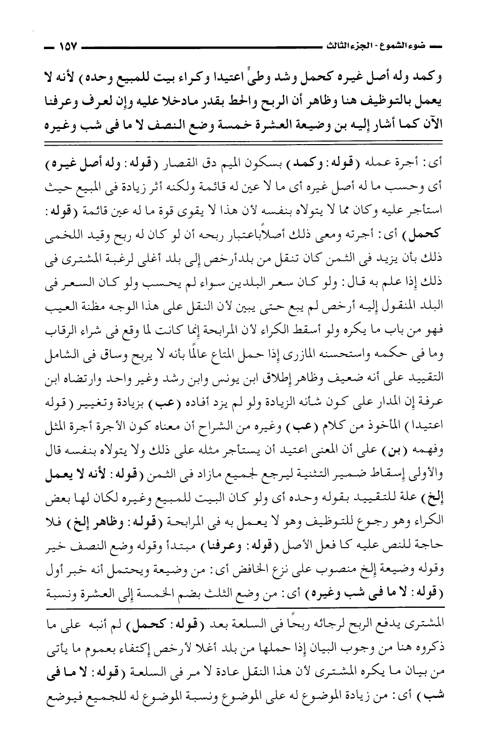 المشترى يدفع الربح لرجائه ربحًا فى السلعة بعد (قوله: كحمل) لم أنبه على ما ذكروه هنا من وجوب البيان إذا حملها من بلد أغلا لأرخص إكتفاء بعموم ما يأتى من بيان ما يكره المشترى لأن هذا النقل عادة لا مر فى السلعة (قوله: لا ما فى شب) أى: من زيادة الموضوع له على الموضوع ونسبة الموضوع له للجميع فيوضع