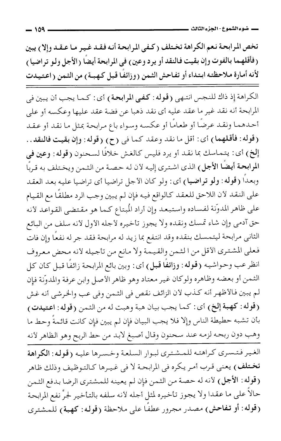 الغير فتسرى كراهته للمشترى لبوار السلعة وخسرها عليه (قوله: الكراهة تختلف) يعنى قرب أمر يكره فى المرابحة لا فى غيرها كالتوظيف وذلك ظاهر (قوله: الأجل) لأنه له حصة من الثمن فإن لم يعينه للمشترى الرضا بدفع الثمن حالًا على ما عقدا ولا يجوز تأخيره لمثل أجله لأنه سلفه بالتأخير لجرَّ نفع المرابحة (قوله: أو تفاحش) مصدر مجرور عطفًا على ملاحظة (قوله: كهبة) للمشترى