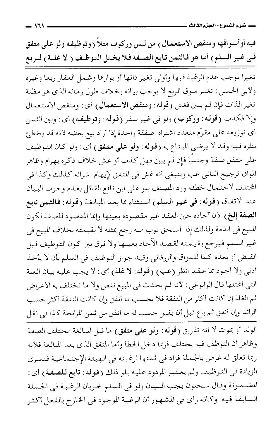 تغيرا بوجب عدم الرغبة فيها واولى تغير ذاتها أو بوارها وشمل العقار ربعا وغيره ولأبى الحسن: تغير سوق الربع لا يوجب بيانه بخلاف طول زمانه الذى هو مظنة تغير الذات فإن لم يبين فغش (قوله: ومنقص الاستعمال) أى: ومنقص الاستعمال وإلا فكذب (قوله: وركوب) ولو في غير سفر (قوله: وتوظيفه) أى: وبين الثمن أى توزيعه على مقوّم متعدد اشتراه صفقة واحدة إذا أراد بيع بعضه لأنه قد يخطئ نظره فيه وقد لا يرضى لمبتاع به (قوله: ولو على متفق) أى: ولو كان التوظيف علفى متفق صفة وجنسًا فإن لم يبين فهل كذب أو غش خلاف ذكره بهرام وظاهر المواق ترجيح الثانى عب وينبغى أنه غش فى المتفق لإيهام شرائه كذلك وكذا فى المختلف لاحتمال خطئه ورد المصنف بلو على ابن نافع القائل بعدم وجوب البيان عند الاتفاق (قوله: فى غير السلم) استثناء مما بعد المبالغة (قوله: فالثمن تابع الصفة إلخ) لأن آحاده حين العقد غير مقصودة بعينها وإنما المقصود للصفة لكون المبيع فى الذمة ولذلك إذا استحق ثوب منه رجع بمثله لا بقيمته بخلاف المبيع فى غير السلم فيرجع بقيمته لقصد الآحاد بعينها ولا فرق بين كون التوظيف قبل القبض أو بعده كما للمواق والزرقانى وقيد جواز التوظيف فى السلم بأن لا يأحذ أدنى ولا أجود مما عقد النظر (عب) (قوله: لا غلة) أى: لا يجب عليه بيان الغلة التى اغتلها قال الوانوغى: لأنه لم يحدث فى المبيع نقص ولا ما تختلف به الأغراض ثم الغلة إن كانت أكثر من النفقة فلا يحسب ما أنفق وإن كانت النفقة أكثر حسب الزائد وإن أنفق ثم باع قبل أن يقبل حسب له ما أنفق من ثمن المرابحة كذا فى نقل