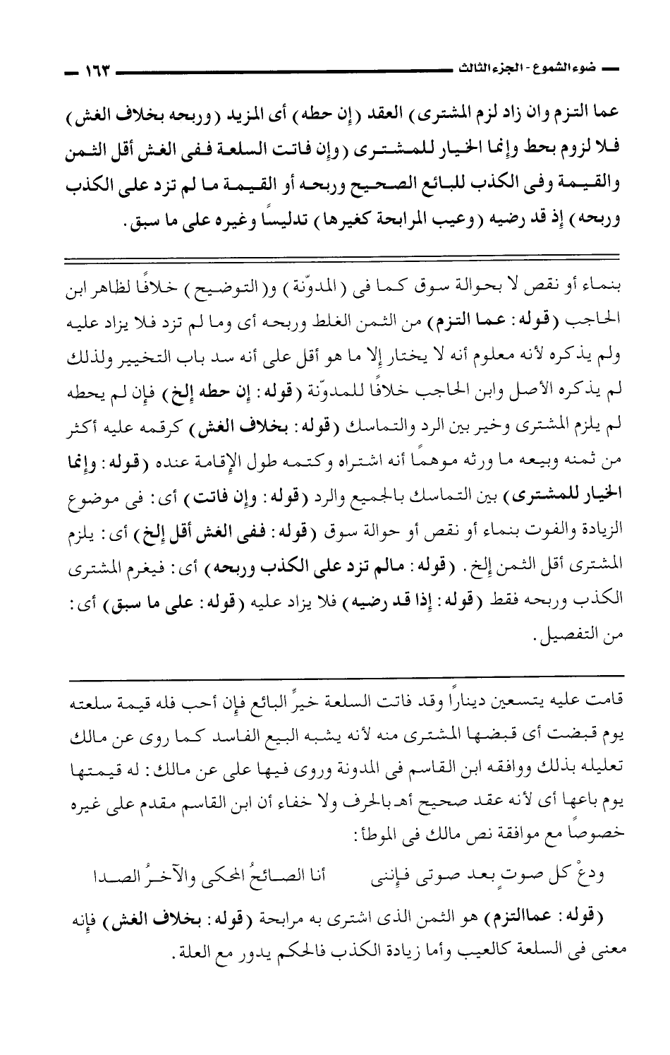 بنماء أو نقص لا بحوالة سوق كما فى (المدوّنة) و (التوضيح) خلافًا لظاهر ابن الحاجب (قوله: عما التزم) من الثمن الغلط وربحه أى وما لم تزد فلا يزاد عليه ولم يذكره لأنه معلوم أنه لا يختار إلا ما هو أقل على أنه سد باب التخيير ولذلك لم يذكره الأصل وابن الحاجب خلافًا للمدوّنة (قوله: إن حط إلخ) فإن لم يحطه لم يلزم المشترى وخير بين الرد والتماسك (قوله: بخلاف الغش) كرقمه عليه أكثر من ثمنه وبيعه ما ورثه موهمًا أنه اشتراه وكتمه طول الإقامة عنده (قوله: وإنما الخيار للمشترى) بين التماسك بالجميع والرد (قوله: وإن فاتت) أى: فى موضوع الزيادة والفوت بنماء أو نقص أو حوالة سوق (قوله: ففى الغش أقل إلخ) أى: يلزم المشترى أقل الثمن إلخ. (قوله: مالم تزيد على الكذب وربحه) أى: فيغرم المشترى الكذب وربحه فقط (قوله: إذا قد رضيه) فلا يزاد عليه قوله: على ما سبق) أى: من التفصيل.