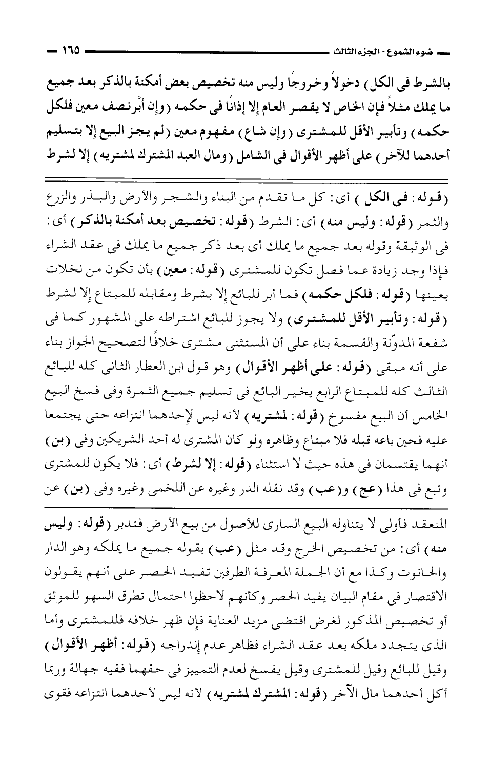 بالشرط فى الكل) دخولًا وخروجًا وليس منه تخصيص بعض أمكنة بالذكر بعد جميع ما يملك مثلًا فإن الخاص لا يقصر العام إلا إذانًا فى حكمه (وإن أبَّر نصف معين فلكل حكمه) وتأبير الأقل للمشترى (وإن شاع) مفهوم معين (لم يجز البيع إلا بتسليم أحدهما للآخر) على أظهر فى الشامل (ومال العبد المشترك لمشتريه) إلا لشرط