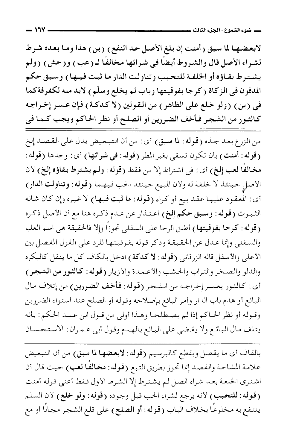 لابعضها لما سبق (أمنت إن بلغ الأصل حد النفع) (بن) هذا وما بعده شرط لشراء الأصل قال والشروط أيضًا فى شرائها مخالفًا لـ (عب) و (حش) (ولم يشترط بقاؤه أو الخلفة للتحبب وتناولت الدار ما ثبت فيها) وسبق حكم المدفون فى الزكاة (جرجا بفوقيتها وباب لم يخلع وسلّم) لابد منه لكفرفة كما فى (بن) (ولو خلع على الظاهر) من القولين (لا كدكة) فإن عسر إخراجه كالثور من الشجر فأخف الضررين أو الصلح أو نظر الحاكم ويجب كما فى