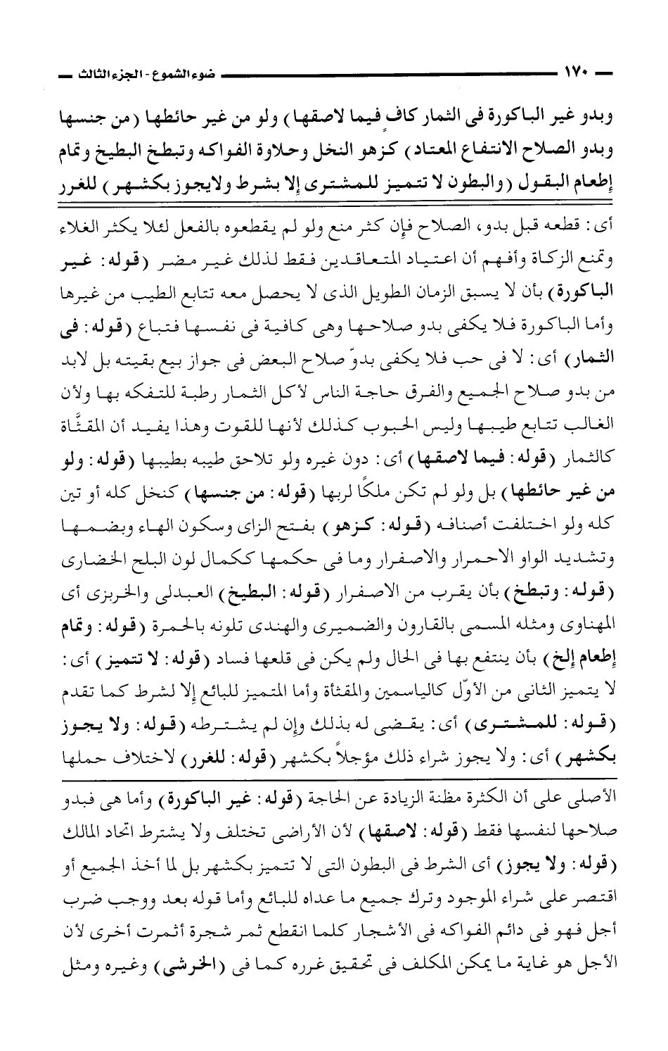 الأصلى على أن الكثرة مظنة الزيادة عن الحاجة (قوله: غير الباكورة) وأما هى فبدو صلاحها لنفسها فقط (قوله: لاصقها) لأن الأراضى تختلف ولا يشترط اتحاد المالك (قوله: ولا يجوز) أى الشرط فى البطون التى لا تتميز بكشهر بل لما أخذ الجميع أو اقتصر على شراء الموجود وترك جميع ما عداه للبائع وأما قوله بعد ووجب ضرب أجل فهو فى دائم الفواكه فى الأشجاب كلما انقطع ثمر شجرة أثمرت أخرى لأن الأجل هو غاية ما يمكن المكلف فى تحقيق غرره كما فى (الخرشى) وغيره ومثل