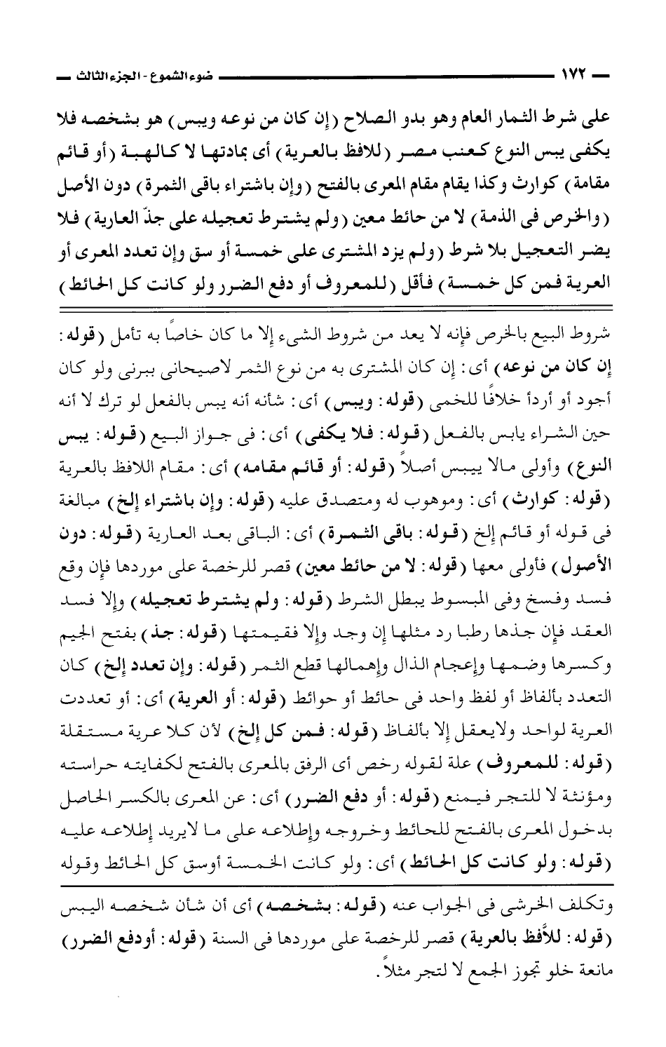 شروط البيع بالخرص فإنه لا يعد من شروط الشئ إلا ما كان خاصًا به تأمل (قوله: إن كان من نوعه) أى: إن كان المشترى به من نوع الثمر لا صيحانى ببرنى ولو كان أجود أو أردأ خلافًا للخممى (قوله: ويبس) أى: شأنه أنه يبس بالفعل لو ترك لا أنه حين الشراء يابس بالفعل (قوله: فلا يكفى) أى: فى جواز البيع (قوله: يبس النوع) وأولى ما لا ييبس أصلًا (قوله: أو قائم مقامه) أى: مقام اللافظ بالعرية (قوله: كوارث) أى: وموهوب له ومتصدق عليه (قوله: وإن باشتراء إلخ) مبالغة فى قوله أو قائم إلخ (قوله: باقى الثمرة) أى: الباقى بعد العارية (قوله: دون الأصول) فأولى معها (قوله: لا منا حائط معين) قصر للرخصة على موردها فإن وقع فسد وفسخ وفى المبسوط يبطل الشرط (قوله: ولم يشترط تعجيله) وإلا فسد العقد فإن جذها رطبا رد مثلها إن وجد وإلا فقيمتها (قوله: جذ) بفتح الجيم وكسرها وضمها وإعجام الذال وإهمالها قطع الثمر (قوله: وإن تعدد إلخ) كان التعدد بألفاظ أو لفظ واحد فى حائط أو حوائط (قوله: أو العرية) أى: أو تعددت العرية لواحد ولا يعقل إلا بألفاظ (قوله: فمن كل إلخ) لأن كلا عرية مستقلة (قوله: للمعروف) علة لقوله رخص أى الرفق بالمعرى بالفتح لكفايته حراسته ومؤنثة لا للتجر فيمنع (قوله: أو دفع الضرر) أى: عن المعرى بالكسر الحاصل بدخول المعرى بالفتح للحائط وخروجه وإطلاعه على ما لا يريد إطلاعه عليه (قوله: ولو كانت كل الحائط) أى: ولو كانت الخمسة أوسق كل الحائط وقوله