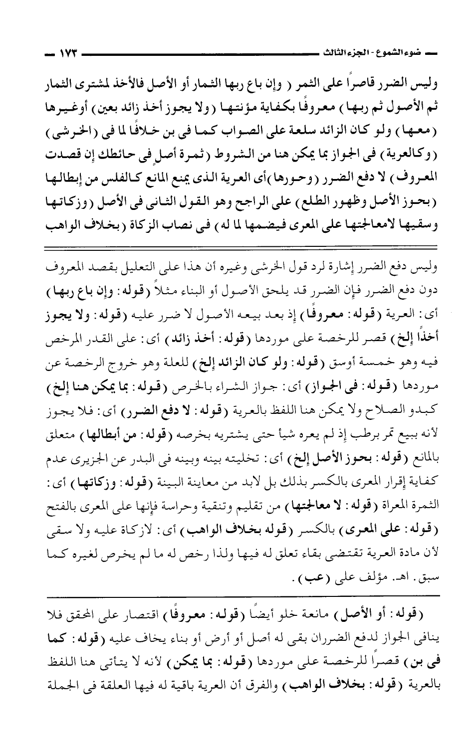 وليس دفع الضرر إشارة لرد قول الخرشى وغيره أن هذا على التعليل بقصد المعروف دون دفع الضرر فإن الضرر قد يلحق الأصول أو البناء مثلًا (قوله: وإن باع ربها) أى: العرية (قوله: معروفًا) إذ بعد بيعه الأصول لا ضرر عليه (قوله: ولا يجوز أخذًا إلخ) قصر للرخصة على موردها (قوله: أخذ زائد) أى: على القدر المرخص فيه وهو خمسة أوسق (قوله: ولو كان الزائد إلخ) للعلة وهو خروج الرخصة عن موردها (قوله: فى الجواز) أى: جواز الشراء بالخرص (قوله: بما يمكن هنا إلخ) كبدو الصلاح ولا يمكن هنا اللفظ بالعرية (قوله: لا دفع الضرر) أى: فلا يجوز لأنه ببيع تمر برطب إذ لم يعره شيئًا حتى يشتريه بخرصه (قوله: من أبطالها) متعلق بالمانع (قوله: بحوز الأصل إلخ) أى: تخليته بينه وبينه فى البدر عن الجزيرى عدم كفاية إقرار المعرى بالكسر بذلك بل لابد من معاينة البينة (قوله: وزكاتها) أى: الثمرة المعراة (قوله: لا معالجتها) من تقليم وتنقية وحراسة فإنها على المعرى بالفتح (قوله: على المعرى) بالكسر (قوله بخلاف الواهب) أى: لا زكاة عليه ولا سقى لأن مادة العرية تقتضى بقاء تعلق له فيها ولذا رخص له ما لم يخرص لغيره كما سبقى. اهـ مؤلف على (عب).