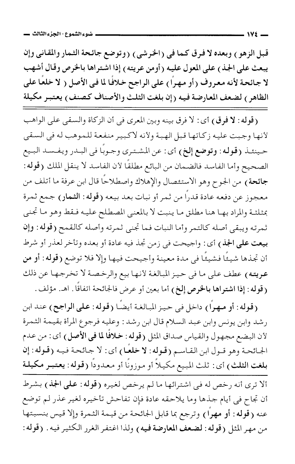ألا ترى أنه رخص له فى اشترائها ما لم يرخص لغيره (قوله: على الجذ) بشرط أن تجاح فى أيام جذها وما يلاحقه عادة فإن تفاحش تأخيره لغير عذر لم توضع عنه (قوله: أو مهرًا) وترجع بما قابل الجائحة من قيمة الثمرة وإلا قيس بنسبتها من مهر المثل (قوله: لضعف المعارضة فيه) ولذا اغتفر لغرر الكثير فيه. (قوله: