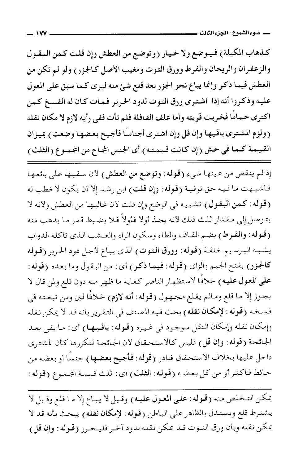 إذ لم ينقص من عينها شئ (قوله: وتوضع من العطش) لأن سقيها على بائعها فأشبهت ما فيه حق توفية (قوله: وإن قلت) ابن رشد إلا أن يكون لا خطب له (قوله: كمن البقول) تشبيه فى الوضع وإن قلت لأن غالبها من العطش ولأنه لا يتوصل إلى مقدار ثلث ذلك لأنه يجذ أولا فأولًا فلا يضبط قدر ما يذهب منه (قوله: والقرط) بضم القاف والطاء وسكون الراء والعشب الذى تأكله الدواب يشبه البرسيم خلقة (قوله: وورق التوت) الذى يباع لأجل دود الحرير (قوله كالجزر) بفتح الجيم والزاى (قوله: فيما ذكر) أى: من البقول وما بعده (قوله: على المعول عليه) خلافًا لاستظهار الناصر كفاية ما ظهر منه دون قلع ولمن قال لا يجوز إلا ما قلع ومالم يقلع مجهول (قوله: أنه لازم) خلافًا لبن ومن تبعته فى فسخه (قوله: لإمكان نقله) بحث فيه المصنف فى التقرير بأنه قد لا يمكن نقله وإمكان نقله وإمكان النقل موجود فى غيره (قوله: باقيها) أى: ما بقى بعد الجائحة (قوله: وإن قل) فليس كالاستحقاق لأن الجائحة لتكررها كأن المشترى داخل عليها بخلاف الاستحقاق فنادر (قوله: فأجيح بعضها) جنسًا أو بعضه من حائط فأكثر أو من كل بعضه (قوله: الثلث) أى: ثلث قيمة المجموع (قوله: