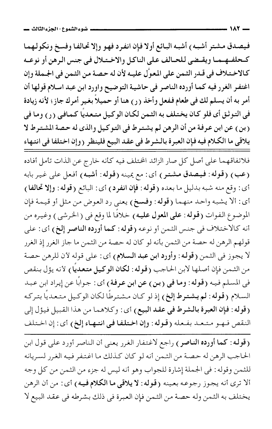 فيصدق مشتر أشبه) أشبه البائع أولا فإن انفرد فهو وإلا تحالفا وفسخ ونكولهما كحلفهما ويقضى للحالف على الناكل والاختلال فى جنس الرهن أو نوعه كالاختلاف فى قدر الثمن على المعوَّل عليه لأنه له حصة من الثمن فى الجملة وإن اغتفر الغرر فيه كما أورده الناصر فى حاشية التوضيح واورد ابن عبد اسلام قولها أن أمر به أن يسلم لك فى طعام ففعل وأخذ (ر) هنا أو حميلًا بغير أمرك جاز؛ لأنه زيادة فى التوثق أى فلو كان يختلف به الثمن لكان الوكيل متعديًا كما فى (ر) وما فى (بن) عن ابن عرفة من أن الرهن لم يشترط فى التوكيل والذى له حصة المشترط لا يلاقى ما الكلام فيه فإن العبرة بالشرط فى عقد البيع فلينظر (وإن اختلفا فى انتهاء