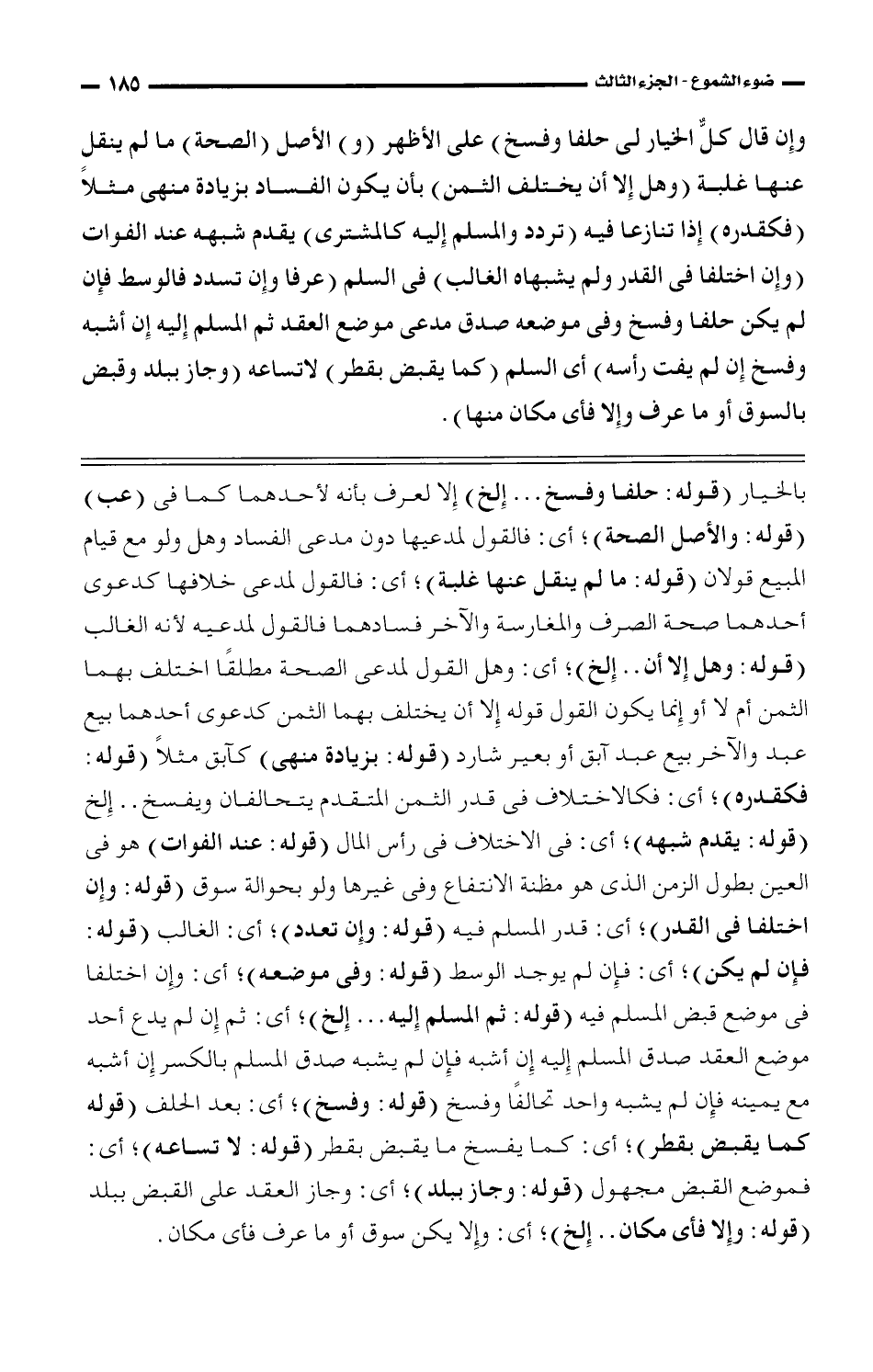 وإن قال كل الخيار لى حلفا وفسخ) على الأظهر (و) الأصل (الصحة) ما لم ينقل عنها غلبة (وهل إلا أن يختلف الثمن) بأن يكون الفساد بزيادة منهى مثلًا (فكقدره) إذا تنازعا فيه (تردد والمسلم إليه كالمشترى) يقدم شبهه عند الفوات (وإن اختلفا فى القدر ولم يشبهاه الغالب) فى السلم (عرفا وإن تسدد فالوسط فإن لم يكن حلفا وفسخ وفى موضعه صدق مدعى موضع العقد ثم المسلم إليه إن أشبه وفسخ إن لم يفت رأسه) أى السلم (كما يقبض بقطر) لاتساعه (وجاز ببلد وقبض بالسوق أو ما عرف وإلا فأى مكان منها).