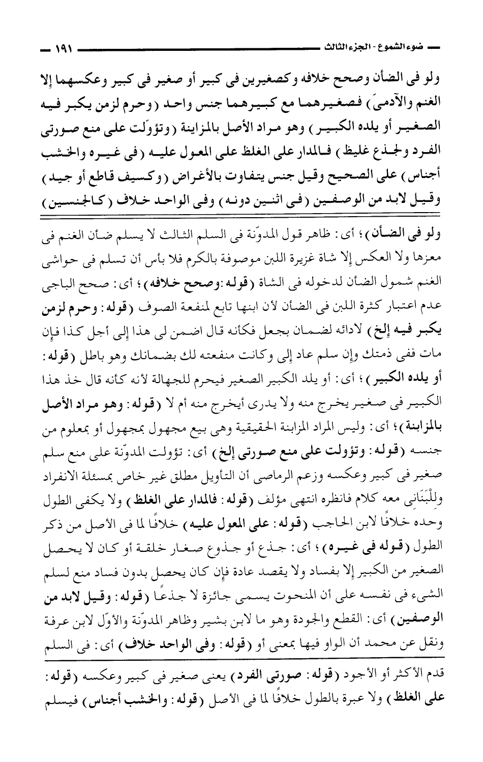 ولو فى الضأن وصحح خلافه وكصغيرين فى كبير أو صغير فى كبير وعكسهما إلا الغنم والآدمىّ) فصغيرهما مع كبيرها جنس واحد (وحرم لزمن يكبر فيه الصغير أو يلده الكبير) وهو مراد الأصل بالمزاينة (وتؤوّلت على منع صورتى الفرد ولجذع غليظ) فالمدار على الغلظ على المعول عليه (لإى غيره والخشب أجناس) على الصحيح وقيل جنس يتفاوت بالأغراض (وكسيف قاطع أو جيد) وقيل لابد من الوصفين (فى اثنين دونه) وفى الواحد خلاف (كالجنسين)