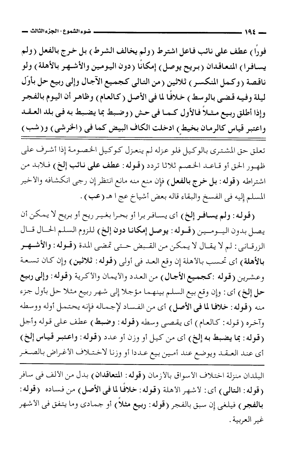البلدان منزلة اختلاف الأسواق بالأزمان (قوله: المتعاقدان) بدل من الألف فى سافر (قوله: التالى) أى: لأشهر الأهلة (قوله: خلافًا لما فى الأصل) من فساده (قوله: بالفجر) فيلغى إن سبق بالفجر (قوله: ربيع مثلًا) أو جمادى وما يتفق فى الأشهر غير العربية.