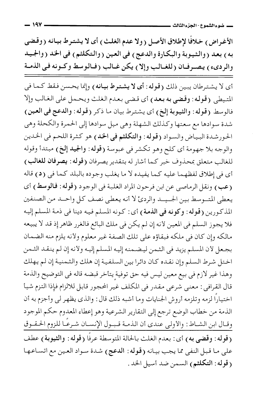 أى لا يشترطان يبين ذلك (قوله: أى لا يشترط بيانه) وإنما يحسن فقط كما فى المتيطى (قوله: وقضى به بعد) أى قضى بعدم الغلث ويحمل على الغالب وإلا فالوسط (قوله: والثيوبة إلخ) أى يشترط بيان ما ذكر (قوله: والدعج فى العين) شدة سوادها مع سعتها وكذلك الشهلة وهى ميل سوادها إلى الحمرة والكحلة وهى الحورشدة البياض والسواد (قوله: والتكلثم فى الخد) هو كثرة اللحم فى الخدين والوجه بلا جهومة أى كلح وهو تكشر فى عبوسة (قوله: والجيد إلخ) مبتدأ وقوله للغالب متعلق بمحذوف خبر كما أشار له بتقدير يصرفان (قوله: يصرفان للغالب) أى فى إطلاق لفظهما عليه كما يفيده لا ما يغلب وجوده بالبلد كما فى (د) قاله (عب) ونقل الرماصى عن ابن فرحون المراد الغلبة فى الوجود (قوله: فالوسط) أى يعطى المتوسط بين الجيد والردئ لا أنه يعطى نصف كل وحد من الصنفين المذكورين (قوله: وكونه فى الذمة) أى: كونه المسلم فيه دينا فى ذمة المسلم إليه فلا يجوز السلم فى المعين لأنه إن لم يكن فى ملك البائع فالغرر ظاهر إذ قد لا يبيعه مالكه وإن كان فى ملكه فبقاؤه على تلك الصفة غير معلوم ولأنه يلزم منه الضمان بجعل لأن المسلم يزيد فى الثمن ليضمنه إليه المسلم إليه ولأنه إن لم ينقد الثمن اختل شرط السلم وإن نقده كان دائرا بين السلفية إنهلك والثمنية إن لم يهلك وهذا غير لازم فى بيع معين ليس فيه حق توفيةٍ يتأخر قبضه قاله فى التوضيح والذمة قال القرافى: معنى شرعى مقدر فى المكلف غير المحجور قابل للالزام فإذا التزم شيأ اختيارًا لزمه وتلزمه أروش الجنايات وما أشبه ذلك قال: والذى يظهر لى وأجزم به أنه الذمة من خطاب الوضع ترجع إلى التقارير الشرعية وهو إعطاء المعدوم حكم الموجود وقال ابن الشاط: والأولى عندى أن الذمة قبول الإنسان شرعًا للزوم الحقوق
