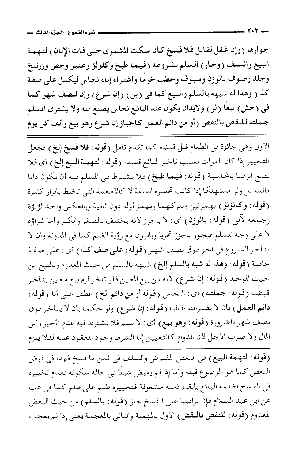 الأول وهى جائزة فى الطعام قبل قبضه كما تقدم تأمل (قوله: فلا فسخ إلخ) فجعل التخيير إذا كان الفوات بسبب تأخير البائع قصدا (قوله: لتهمة البيع إلخ) أى فلا يصح الرضا بالمحاسبة (قوله: فيما طبخ) فلا يشترط فى المسلم فيه أن يكون ذاتا قائمة بل ولو مستهلكا إذا كانت تحصره الصفة لا كالأطعمة التى تخلط بأبزار كثيرة (قوله: وكالؤلؤ) بهمزتين وبتركهما وبهمز أوله دون ثانية وبالعكس واحد لؤلؤة وجمعه لآلى (قوله: بالوزن) أى: لا بالجزز لأنه يختلف بالصغر والكبر وأما شراؤه على على وجه المسلم فيجوز بالجزز تحريا وبالوزن مع رؤية الغنم كما فى المدونة وأن لا يتأخر الشروع فى الجز فوق نصف شهر (قوله: على صف كذا) أى: على صفة خاصة (قوله: وهذا له شبه بالسلم إلخ) شبهة بالسلم من حيث المعدوم وبالبيع من حيث الموجد (قوله: إن شرع) لأنه من بيع المعين فلو تأخر لزم بيع معين يتأخر قبضه (قوله: جملته) أى: النحاس (قوله أو من دائم إلخ) عطف على أنا (قوله: دائم العمل) بأن لا يفترعنه غالبا (قوله: إن شرع) ولو حكما بأن لا يتأخر فوق نصف شهر للضرورة (قوله: وهو بيع) أى: لا سلم فلا يشترط فيه عدم تأخير رأس المال ولا ضرب الأجل لأن الدوام كالتعيين إنما الشرط وجود المعقود عليه لئلا يلزم