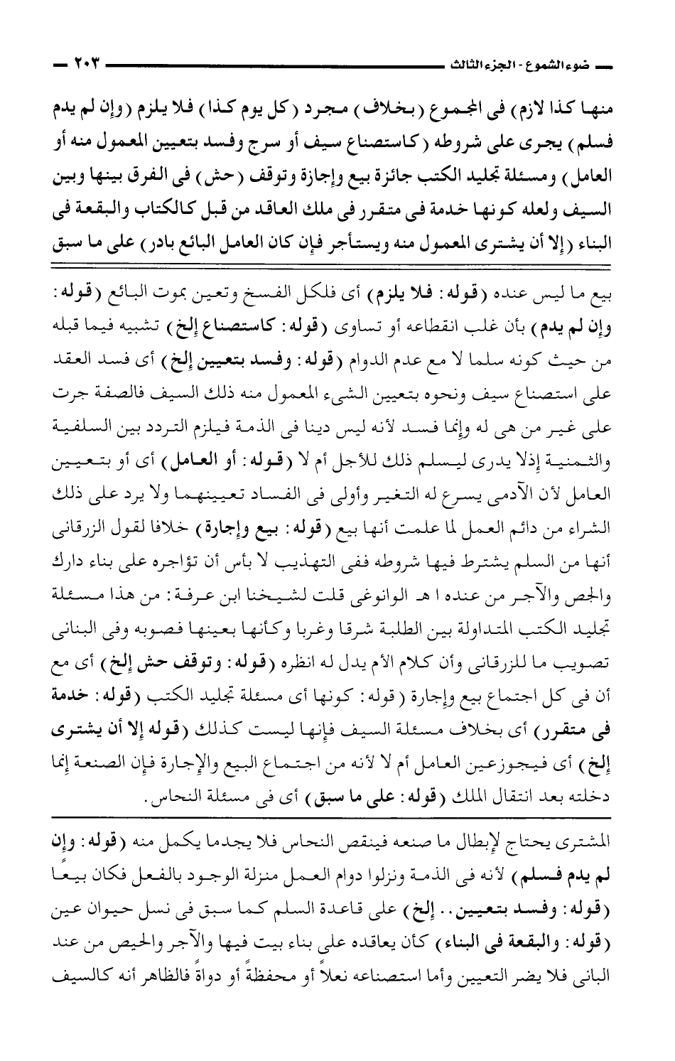 منها كذا لازم) فى المجموع (بخلاف) مجرد (كل يوم كذا) فلا يلزم (وإن لم يدم فسلم) يجرى على شروطه (كاستصناع سيف أو سرج وفسد بتعيين المعمول منه أو العامل) ومسئلة تجليد الكتب جائزة بيع وإجازة وتوقف (حش) فى الفرق بينهما وبين السيف ولعله كونها خدمة فى متقرر فى ملك العاقد من قبل كالكتاب والبقعة فى البناء (إلا أن يشترى المعمول منه ويستأجر فإن كان العامل البائع بادار) على ما سبق