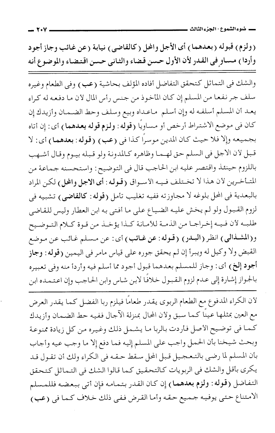 لأن الكراء المدفوع مع الطعام الربوى يقدر طعامًا فيلزم ربا الفضل كما يقدر العرض مع العين بمثلها عينًا كما سبق ولأن المحال بمنزلة الآجال ففيه حط الضمان وأزيدك كما فى توضيح الأصل فأردت بالربا ما يشمل ذلك وغير من كل زيادة ممنوعة وبحث شيخنا بأن الحمل واجب على المسلم إليه فما دفع إلا ما وجب عيه وأجاب بأن المسلم لما رضى بالتعجيل قبل المحل سقط حقه فى الكراء ولك أن تقول قد يكرى بأقل والشك فى الربويات كالتحقيق كما قالوا الشك فى التماثل كتحقق التفاضل (قوله: ولزم بعدهما) إن كان القدر بتمامه فإن أتى ببعضه فللمسلم الامتناع حتى يوفيه جميع حقه وأما القرض ففى ذلك خلاف كما فى (عب)