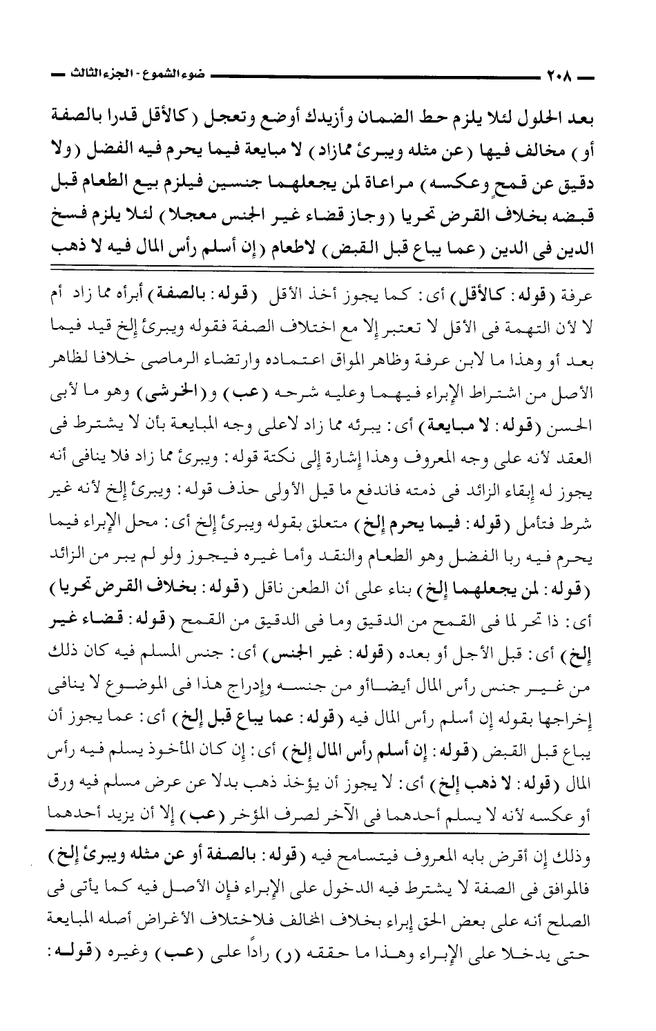 عرفة (قوله: كالأقل) أى: كما يجوز أخذ الأقل (قوله: بالصفة) أبرأه مما زاد أم لا لأن التهمة فى الأقل لا تعتبر إلا مع اختلاف الصفة فقوله ويبرئ إلخ قيد فيما بعد أو وهذا ما لابن عرفة وظاهر المواق اعتماده وارتضاء الرماصى خلافا لظاهر الأصل من اشتراط الإبراء فيهما وعليه شرحه (عب) و (الخرشى) وهو ما لأبى الحسن (قوله: لا مبايعة) أى: يبرئه مما زاد لا على وجه المبايعة بأن لا يشترط فى العقد لأنه على وجه المعروف وهذا إشارة إلى نكتة قوله: ويبرئ مما زاد فلا ينافى أنه يجوز له إبقاء الزائد فى ذمته فاندفع ما قيل الأولى حذف قوله: ويبرئ إلخ لأنه غير شرط فتأمل (قوله: فيما يحرم إلخ) متعلق بقوله ويبرأ إلخ أى: محل الإبراء فيما يحرم فيه ربا الفضل وهو الطعام والنقد وأما غيره فيجوز ولو لم يبر من الزائد (قوله: لمن يجعلهما إلخ) بناء على أن الطعن ناقل (قوله: بخلاف القرض تحريا) أى: ذا تحر لما فى القمح من الدقيق وما فى الدقيق من القمح (قوله: قضاء غير إلخ) أى: قبل الأجل أو بعده (قوله: غير الجنس) أى: جنس المسلم فيه كان ذلك من غير جنس رأس المال أيضا أو من جنسه وإدراج هذا فى الموضوع لا ينافى إخراجها بقول إن أسلم رأس المال فيه (قوله: عما يباع قبل إلخ) أى: عما يجوز أن يباع قبل القبض (قوله: إن أسلم رأس المال إلخ) أى: إن كان المأخوذ يسلم فيه رأس المال (قوله: لا ذهب إلخ) أى: لا يجوز أن يؤخذ ذهب بدلا عن عرض مسلم فيه ورق أو عكسه لأنه لا يسلم أحدهما فى الآخر لصرف المؤخر (عب) إلا أن يزيد أحدهما