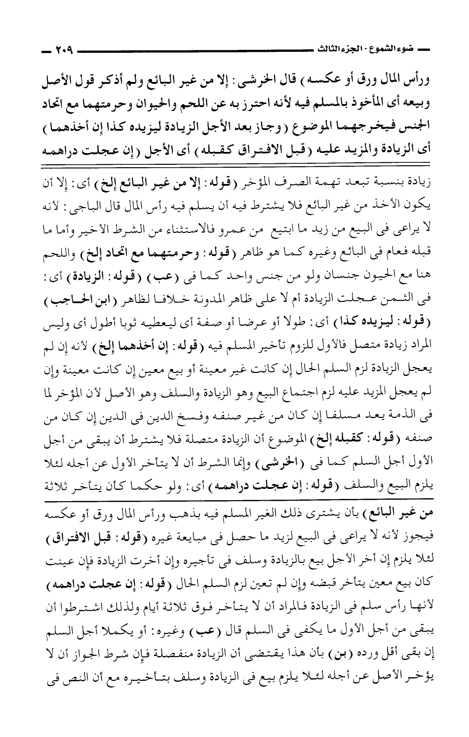 زيادة بنسبة تبعد تهمة الصرف المؤخر (قوله: إلا من غير البائع إلخ) أى: إلا أن يكون الأخذ من غير البائع فلا يشترط فيه أن يسلم فيه رأس المال قال الباجى: لأنه لا يراعى فى البيع من زيد ما ابتيع من عمرو فالاستثناء من الشرط الأخير وأما ما قبله فغام فى البائع وغيره كما هو ظاهر (قوله: وحرمتهما مع اتحاد إلخ) واللحم هنا مع الحيوان جنسان ولو من جنس واحد كما فى (عب) (قوله: الزيادة) أى: فى الثمن عجلت الزيادة أم لا على ظاهر المدونة خلافا لظاهر (ابن الحاجب) (قوله: ليزيده كذا) أى: طولا أو عرضا أو صفة أى ليعطيه ثوبا أطول أى وليس المراد زيادة متصل فالأول للزوم تأخير المسلم فيه (قوله: إن أخذهما إلخ) لأنه إن لم يعجل الزيادة لزم السلم الحال إن كانت غير معينة أو بيع معين إن كانت معينة وإن لم يعجل المزيد عليه لزم اجتماع البيع وهو الزيادة والسلف وهو الأصل لأن المؤخر لما فى الذمة يعد مسلفا إن كان من غير صنفه وفسخ الدين فى الدين إن كان من صنفه (قوله: كقبله إلخ) الموضوع أن الزيادة متصلة فلا يشترط أن يبقى من أجل الأول أجل السلم كما فى (الخرشى) وإنما الشرط أن لا يتأخر الأول عن أجله لئلا يلزم البيع والسلف (قوله: إن عجلت دراهمه) أى: ولو حكما كأن يتأخر ثلاثة
