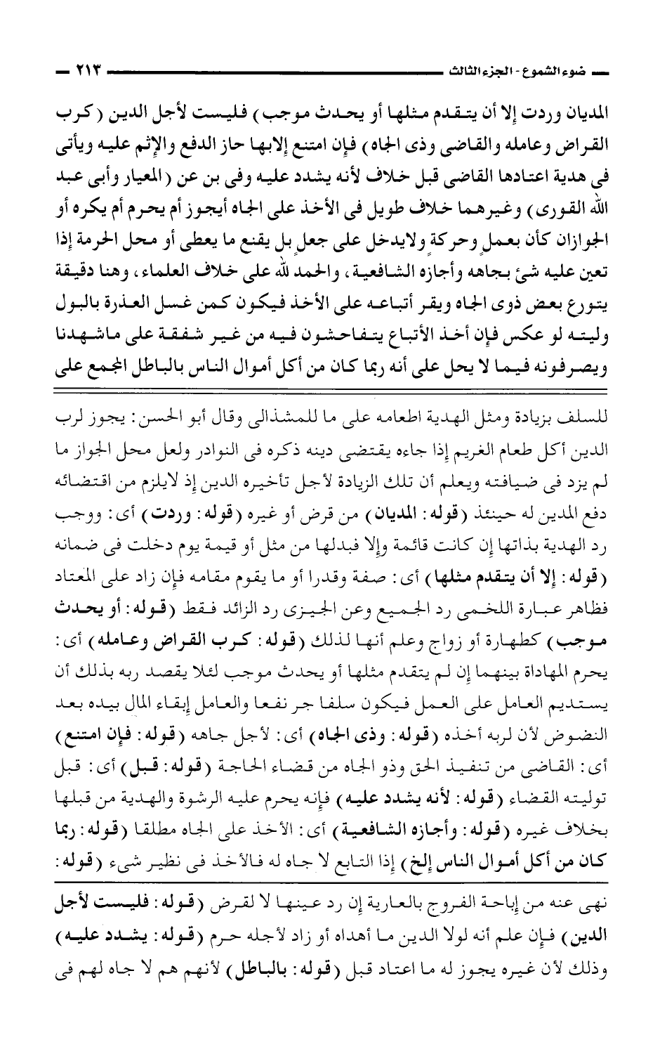 المديان وردت إلا أن يتقدم مثلها أو يحدث موجب) فليست لأجل الدين (كرب القراض وعامله والقاضى وذى الجاه) فإن امتنع إلا بها حاز الدفع والإثم عليه ويأتى فى هدية اعتادها القاضى قبل خلاف لأنه يشدد عليه وفى بن عن (المعيار وأبى عبد الله القورى) وغيرهما خلاف طويل فى الأخذ على الجاه أيجوز أم يحرم أم يكره أو الجوازان كأن بعمل وحركة ولا يدخل على جعلٍ بلا يقنع ما يعطى أو محل الحرمة إذا تعين عليه شئ بجاهه وأجازه الشافعية, والحمد لله على خلاف العلماء, وهنا دقيقة يتورع بعض ذوى الجاه ويقر أتباعه على الأخذ فيكون كمن غسل العذرة بالبول وليته لو عكس فإن أخذ الأتباع يتفاحشون فيه من غير شفقة على ما شهدنا ويصرفونه فيما لا يحل على أنه ربما كان من أكل أموال الناس بالباطل المجمع على