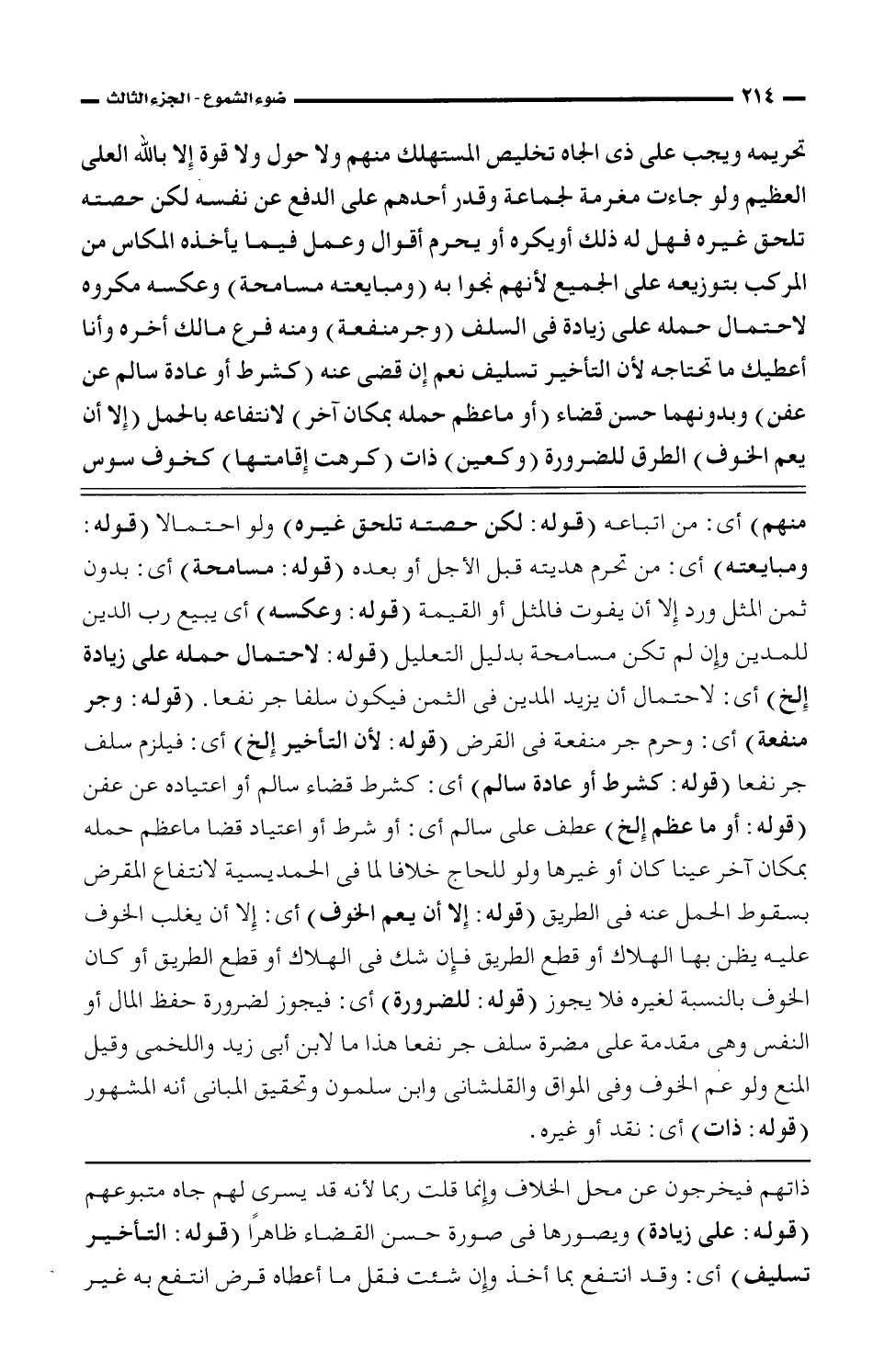 تحريمه ويجب على ذى الجاه تخليص المستهلك منهم ولا حول ولا قوةإلا بالله العلى العظيم ولو جاءت مغرمة لجماعة وقدر أحدهم على الدفع عن نفسه لكن حصته تلحق غيره فهل له ذلك أو يكره أو يحرم أقوال وعمل فيما يأخذه المكاس من المركب بتوزيعه على الجميع لأنهم نجوا به (ومبايعته مسامحة) وعكسه مكروه لاحتمال حمله على زيادة فى السلف (وجر منفعة) ومنه فرع مالك أخره وأنا أعطيك ما تحتاجه لأن التأخير تسليف نعم إن قضى عنه (كشرط أو عادة سالم عن عفن) وبدونهما حسن قضاء (أو ما عظم حمله بمكان آخر) لانتفاعه بالحمل (إلا أن يعم الخوف) الطرق للضرورة (وكعين) ذات (كرهت إقامتها) كخوف سوس