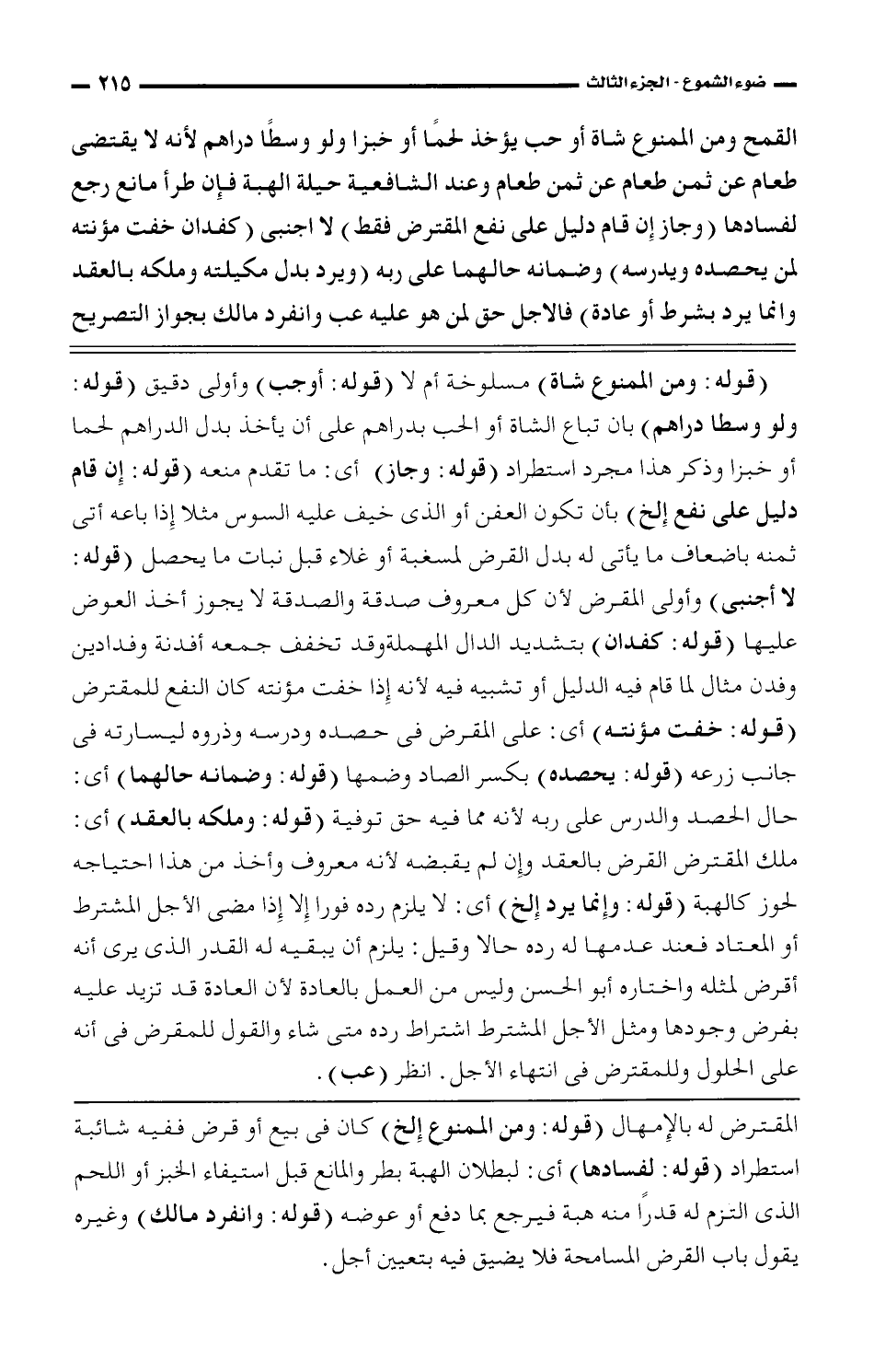 القمح ومن الممنوع شاة أو حب يؤخذ لحمًا أو خبزا ولو وسطًا دراهم لأنه لا يقتضى طعام عن ثمن طعام عن ثمن طعام وعند الشافعية حيلة الهبة فإن طرأ مانع رجع لفسادهما (وجاز إن قام دليل على نفع المقترض فقط) لا أجنبى (كفدان خفت مؤنته لمن يحصده ويدرسه) وضمانه حالهما على ربه (ويرد بدل مكيلته وملكه بالعقد وإنما يرد بشرط أو عادة) فالأجل حق لمن هو عليه عب وانفرد مالك بجواز التصريح